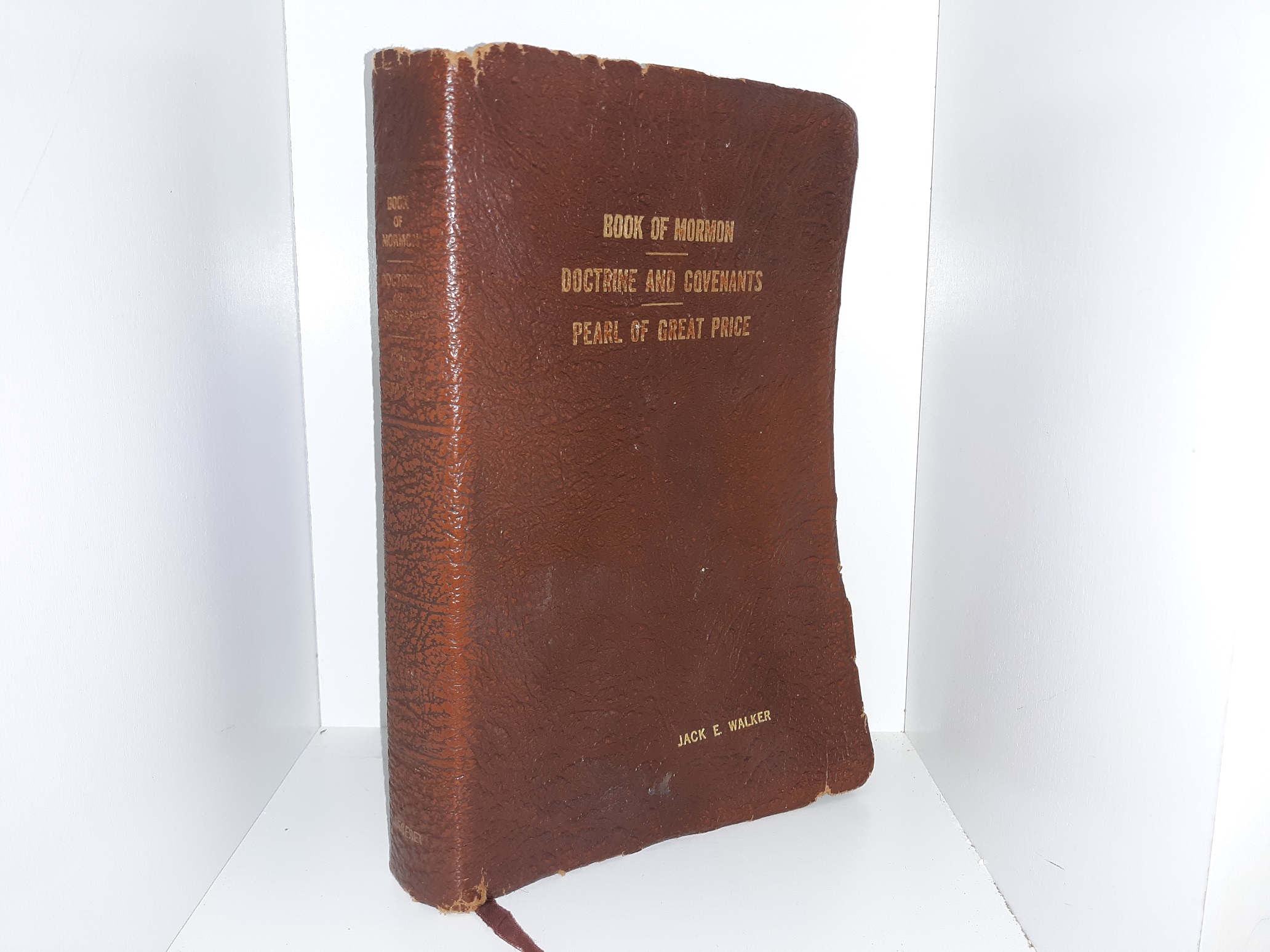 Poor condition, brown, leather-like book. The cover has the name of a previous owner engraved upon it, many small tears on the edges and corners, fraying, peeling, scuffs, fading, and small stains. The first flyleaf has a sticker on the back of it. The second flyleaf has writing in pencil. Text throughout is clean, clear, and legible.