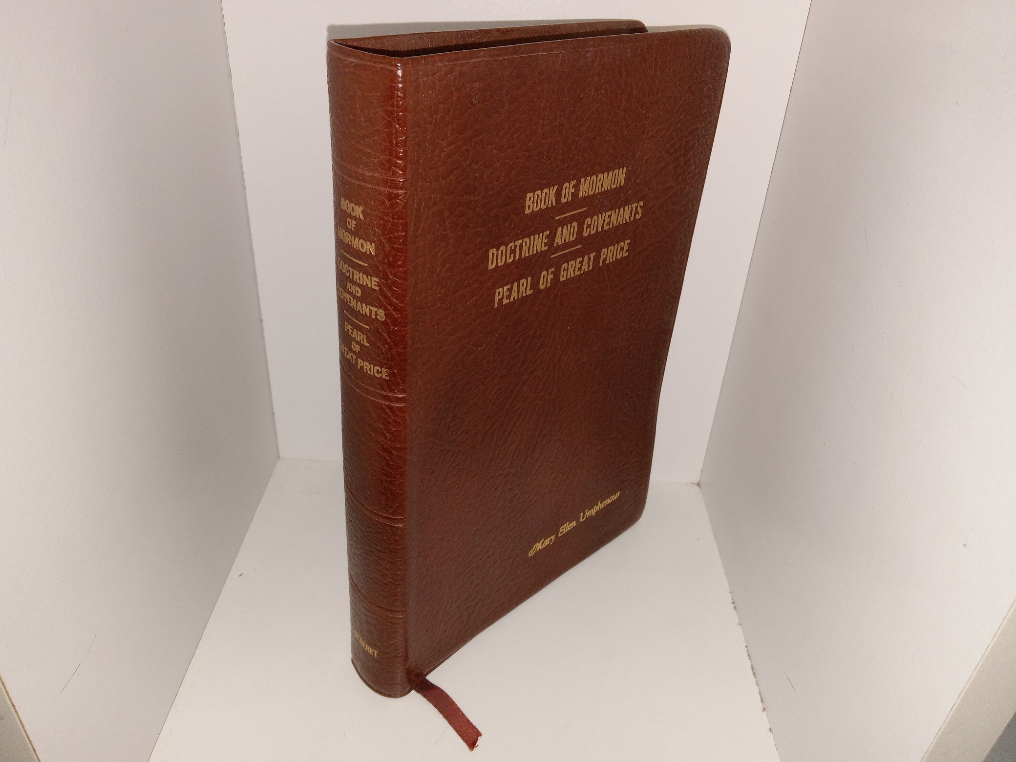 Fair condition, brown, leather-bound book. The cover has a crease, and the name of a previous owner engraved upon it. Some pages have highlighting in marker. The second flyleaf has writing in pen and pencil on both sides.