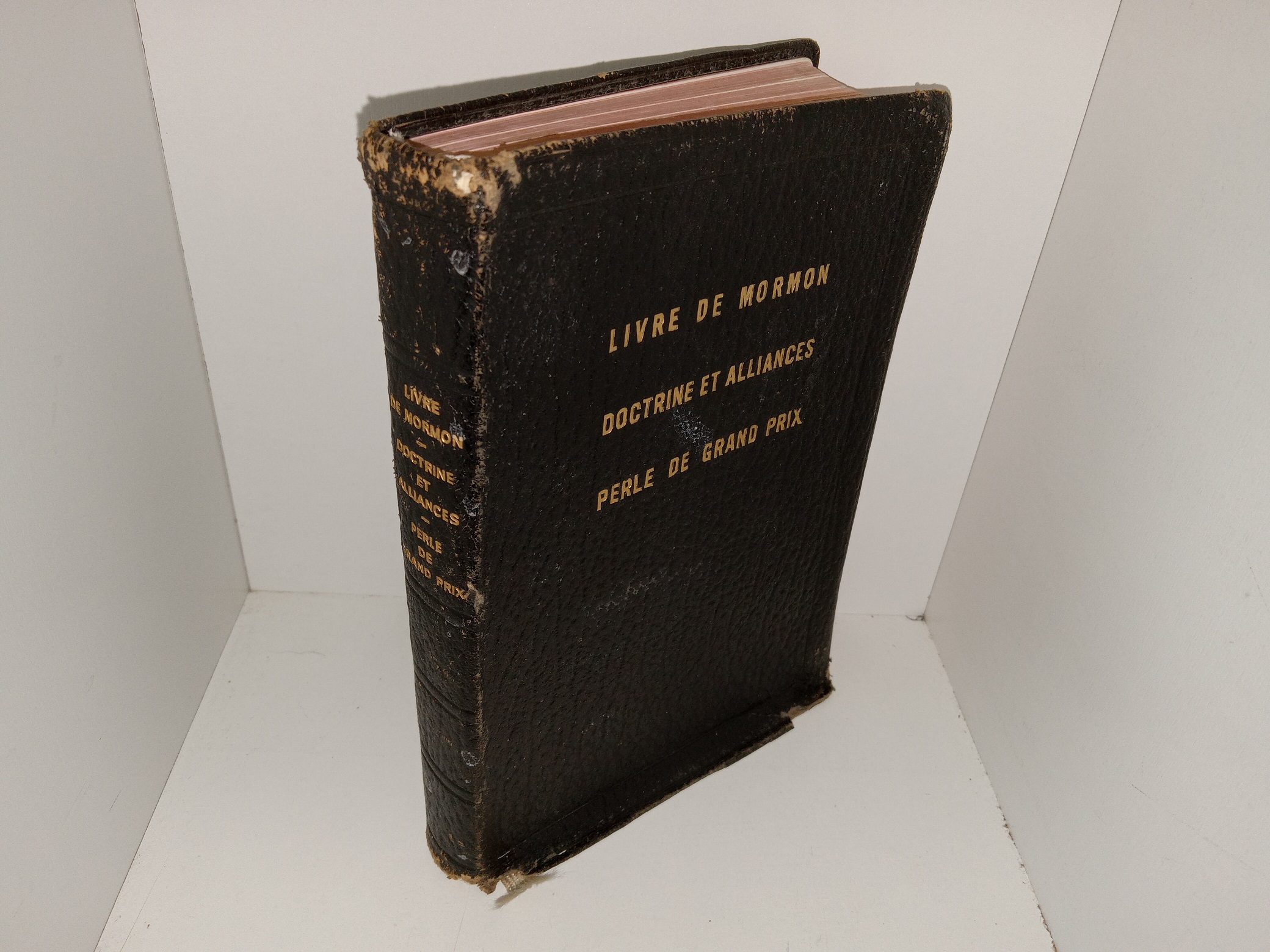 Fair condition, black, leather-bound book. The cover has small pieces torn off, tears, scuffing, minor creasing, and some small stains. The internal binding is torn. The second flyleaf has writing in pen and pencil. Text throughout is clear and legible.
