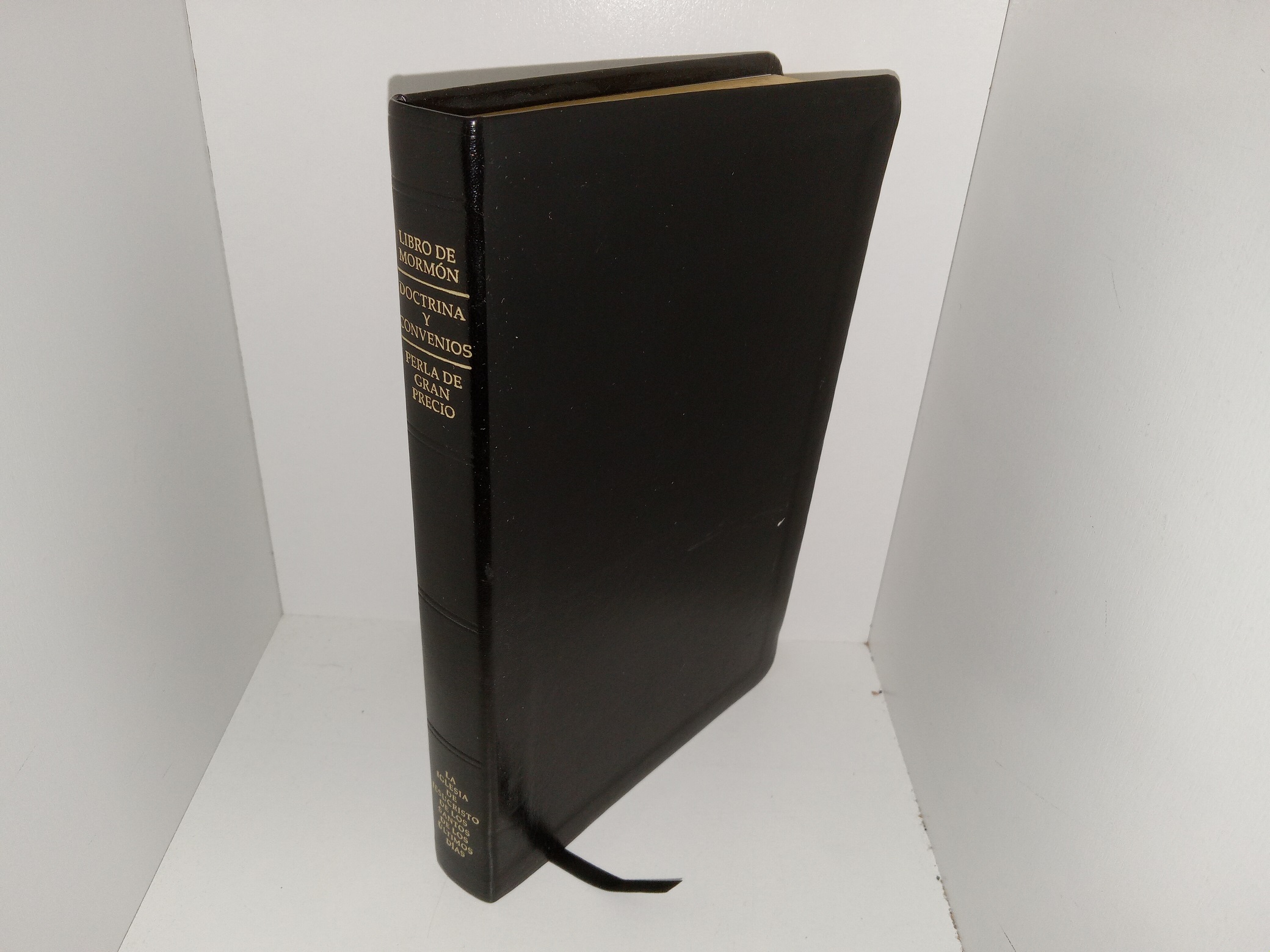 Good condition, black, leather-bound book. The cover has some pale scuff marks, scratches, and some adhesive residue. The second flyleaf has writing in pencil and scuff marks. Text and illustrations throughout are clean, clear, and legible.