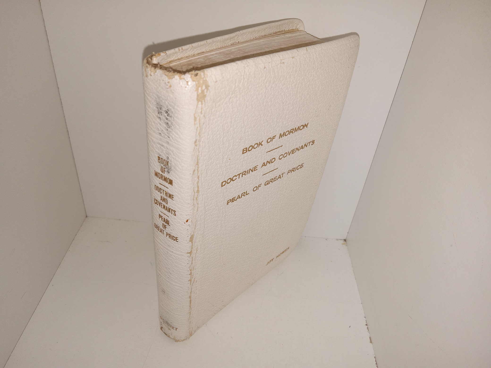 Fair condition, white, leather-bound book. The cover has peeling, scuffing, wrinkling, pieces torn off, scuffing, some tiny stains, and the name of a previous owner engraved on the front. Some pages have stains, creases, scuffing on the edges, highlighting, marks, or writing in marker, pen, or pencil, or eraser marks.