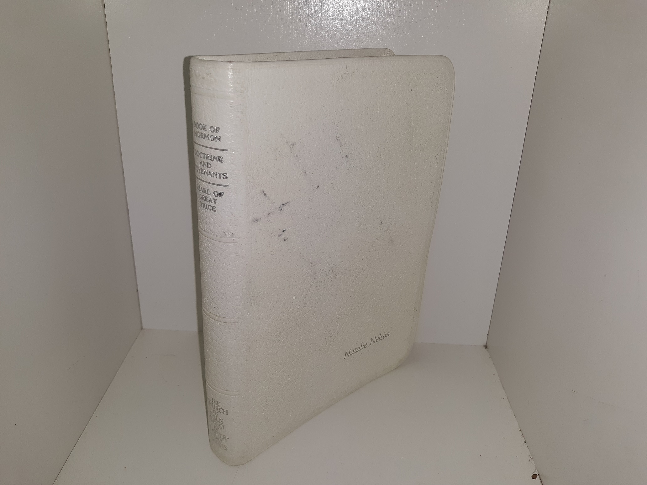 Fair-good condition, white, leather-bound book. The cover has scuff marks. the second flyleaf has writing in pencil. Some pages have highlighting in marker.