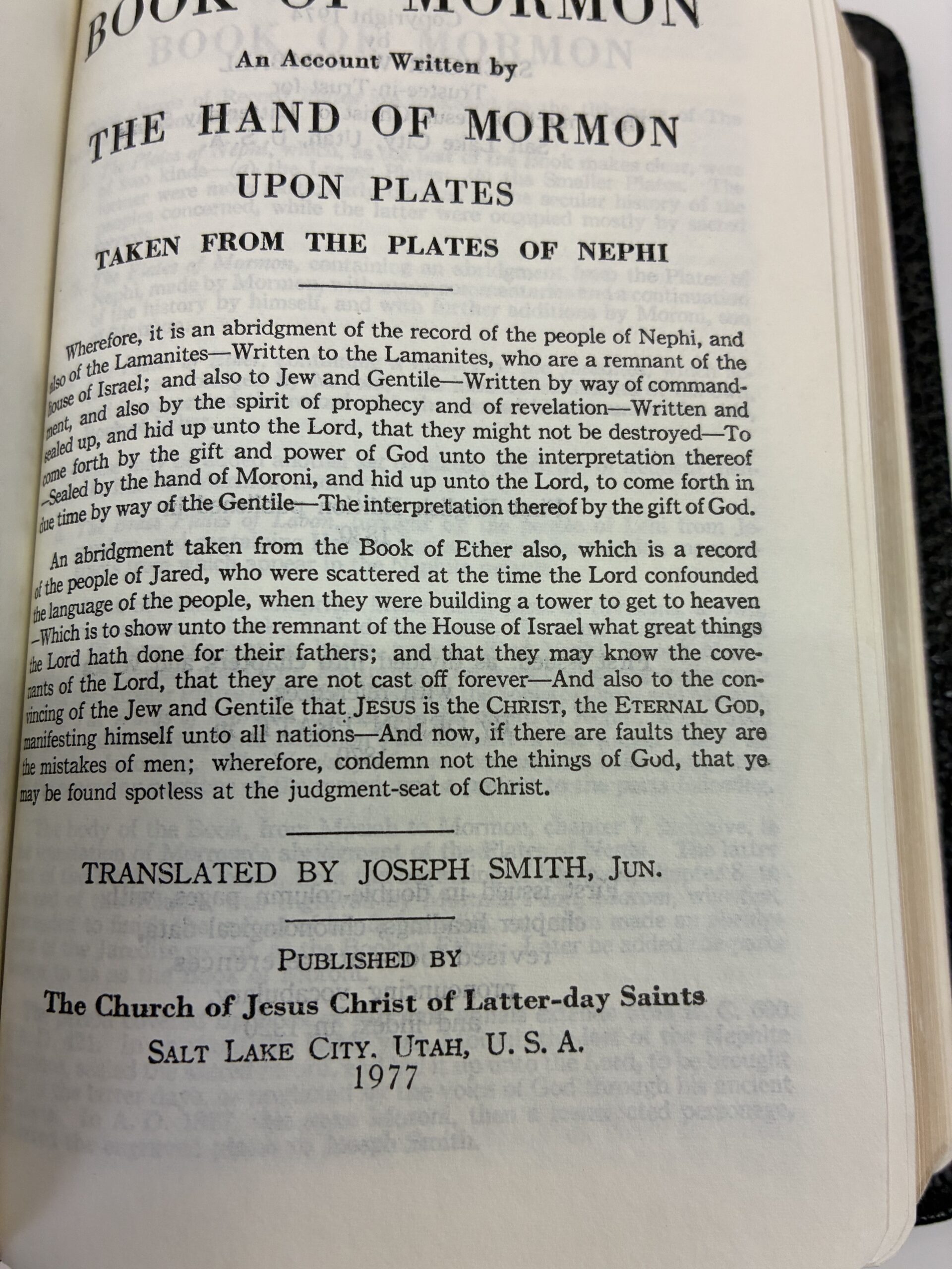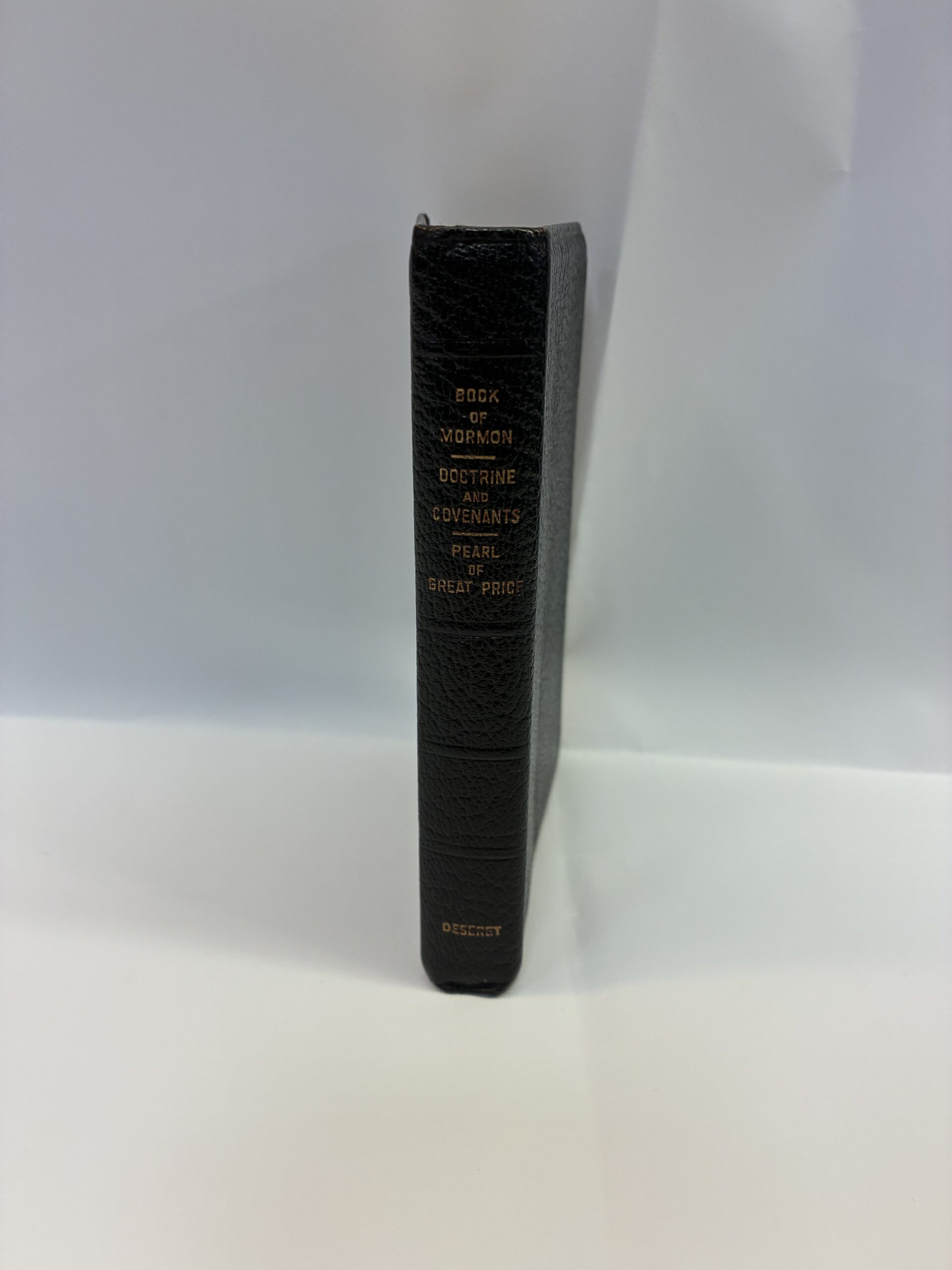 Mini copy of the Book of Mormon, Doctrine and Covenants, and Pearl of Great Price. Leather bound, 1977.