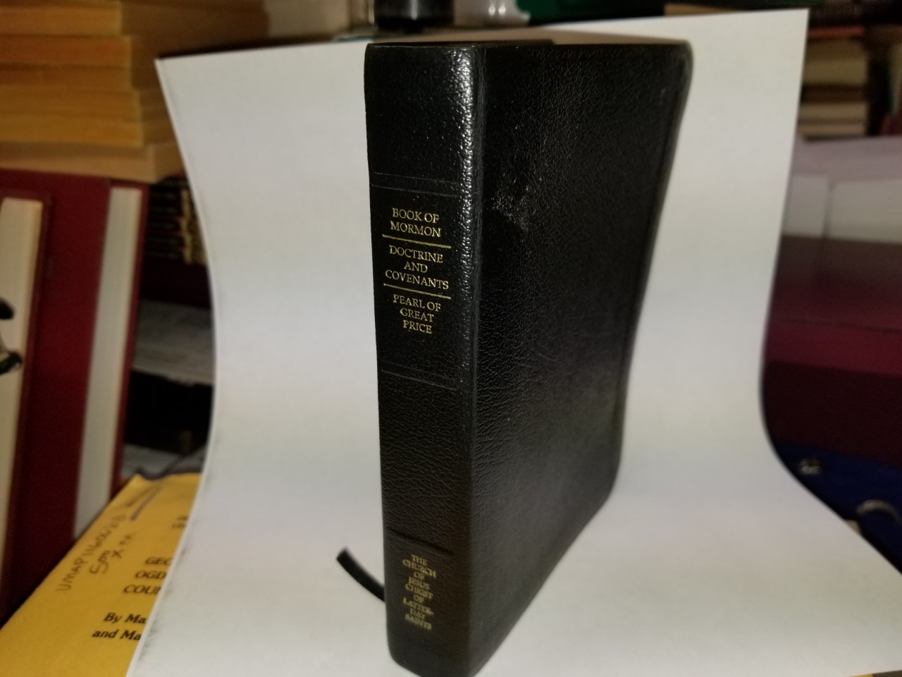 This is a triple combination: Book of Mormon, Doctrine and Covenants, and Pearl of Great Price. This small size black leather volume is in very good condition; no name engraved on the cover (which they usually do.) Most of the text is clean throughout although there are pages with pencil or ink, or even marker highlightings or markings. Still, a very nice small size copy!