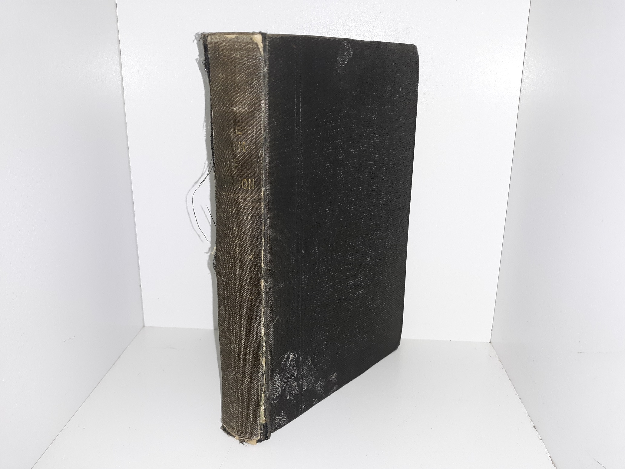 Fair condition, black hardcover with no dust jacket. The cover has long tears and fraying at the edges of the spine, some stains, scuffing, and bent corners. The internal binding is also torn. The front inside cover has writing in pen, and an old address sticker. The front flyleaf has a lengthy inscription written in pen, some writing in pencil, and some eraser marks. Pgs. 25-26 have had very large pieces cut off. Some pages are creased. Text throughout is legible.