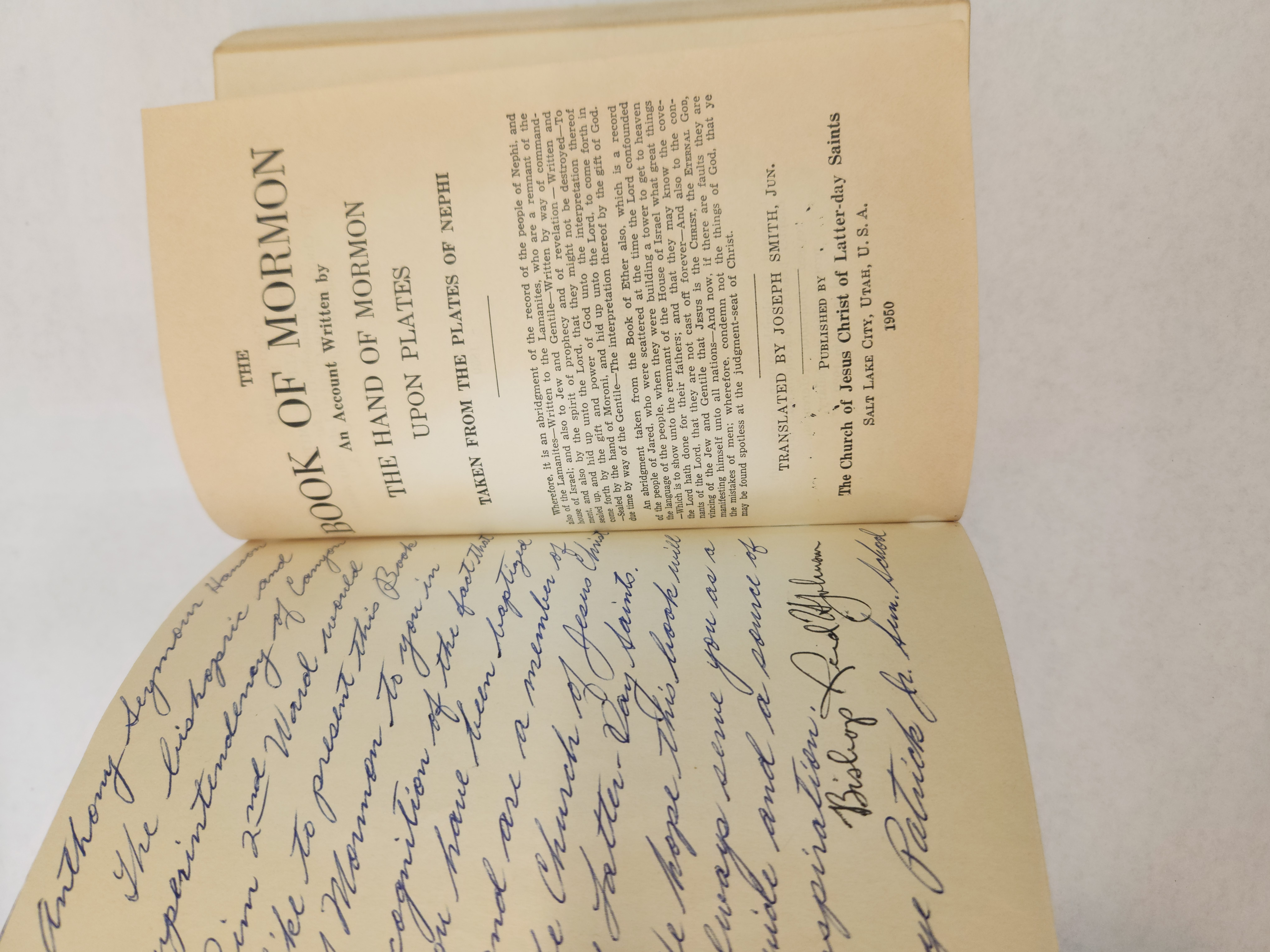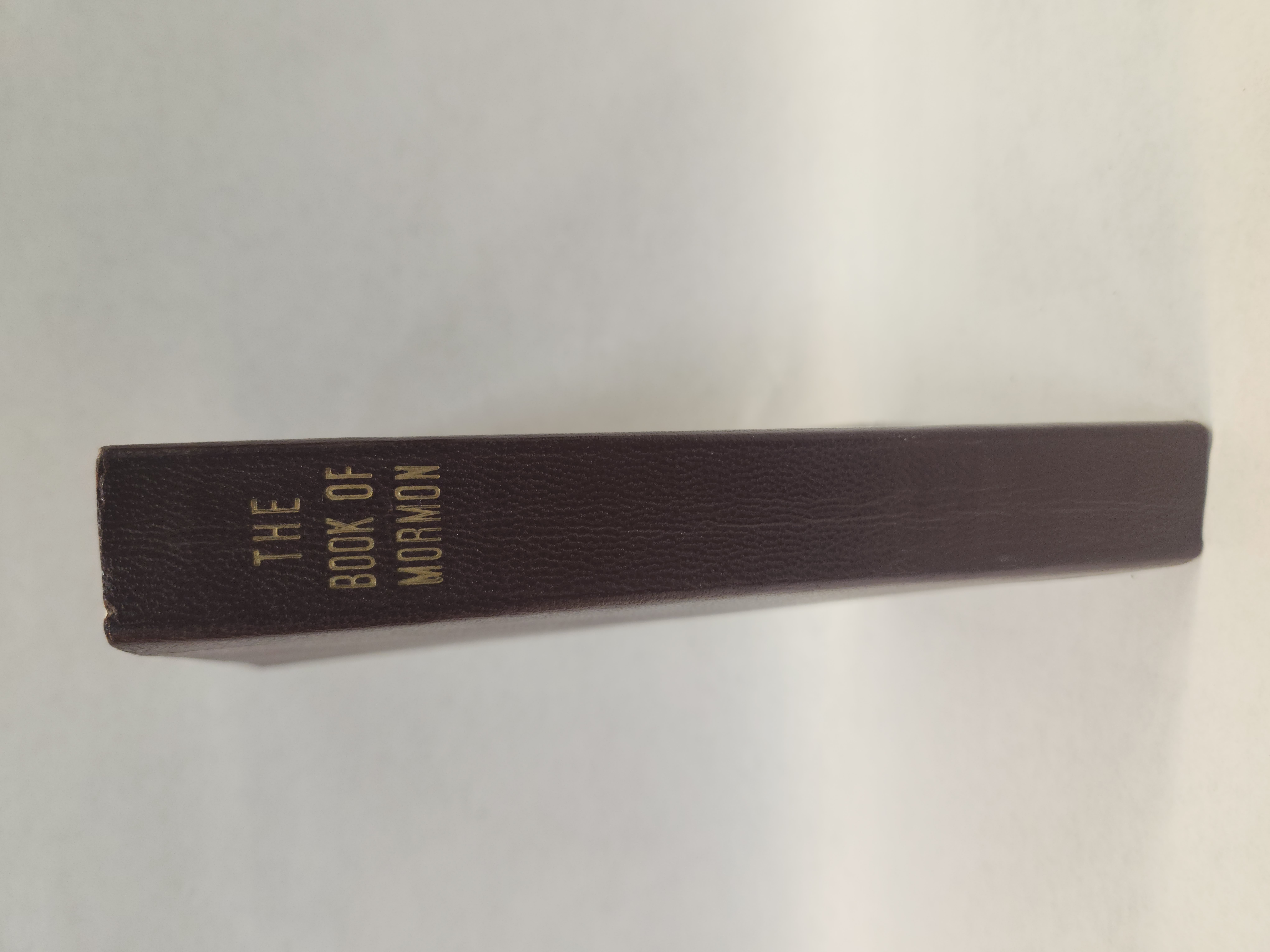 The Book of Mormon (1950, Maroon Faux Leather) No marks/writing on pages except for first blank page (see pic in gallery). Corner and edges show moderate shelf wear. Binding is good. Spine is slightly warped so it does not lay straight up and down (see pic in gallery). Back cover has a bend mark. Front cover has a couple smudge marks.