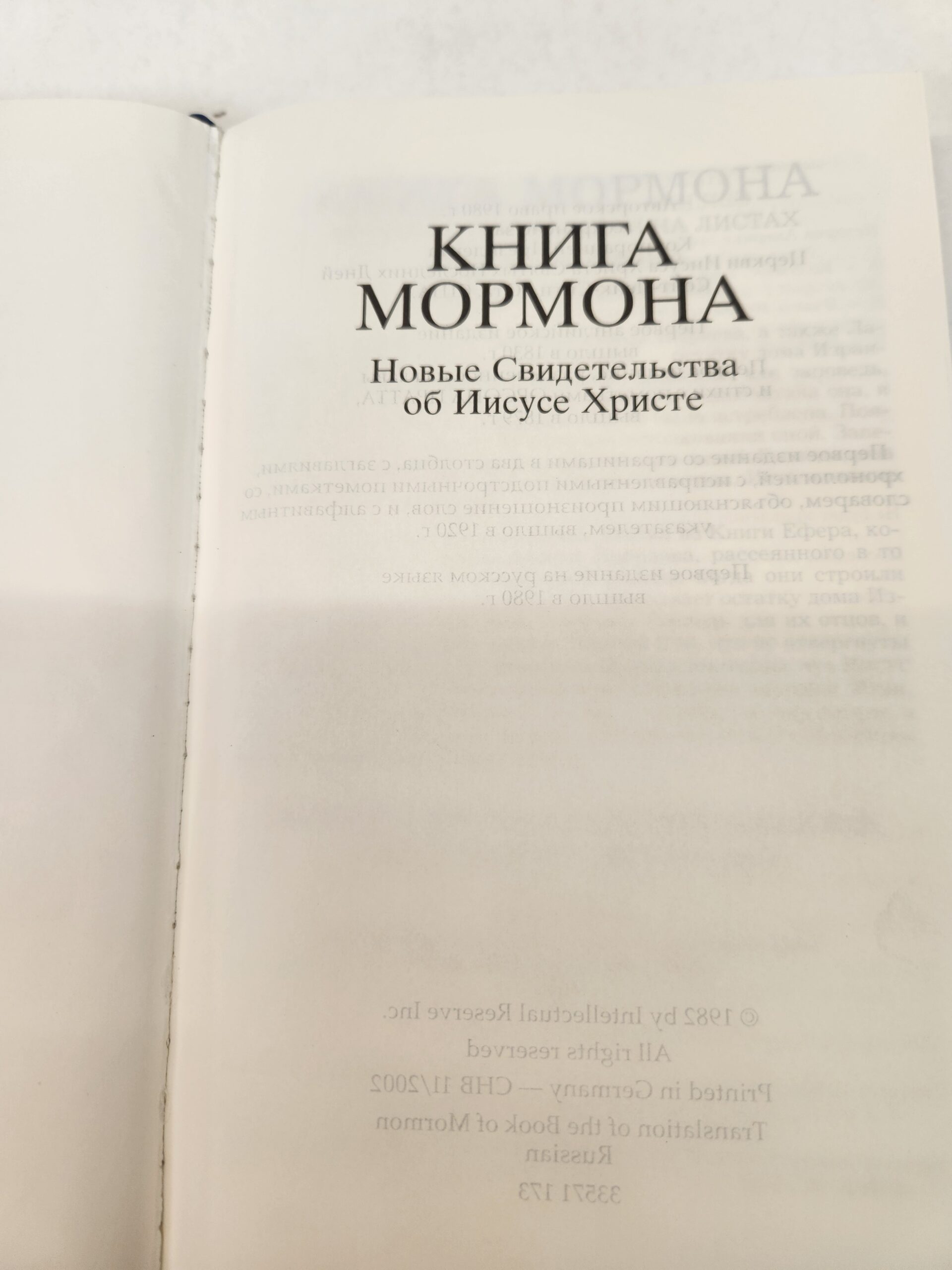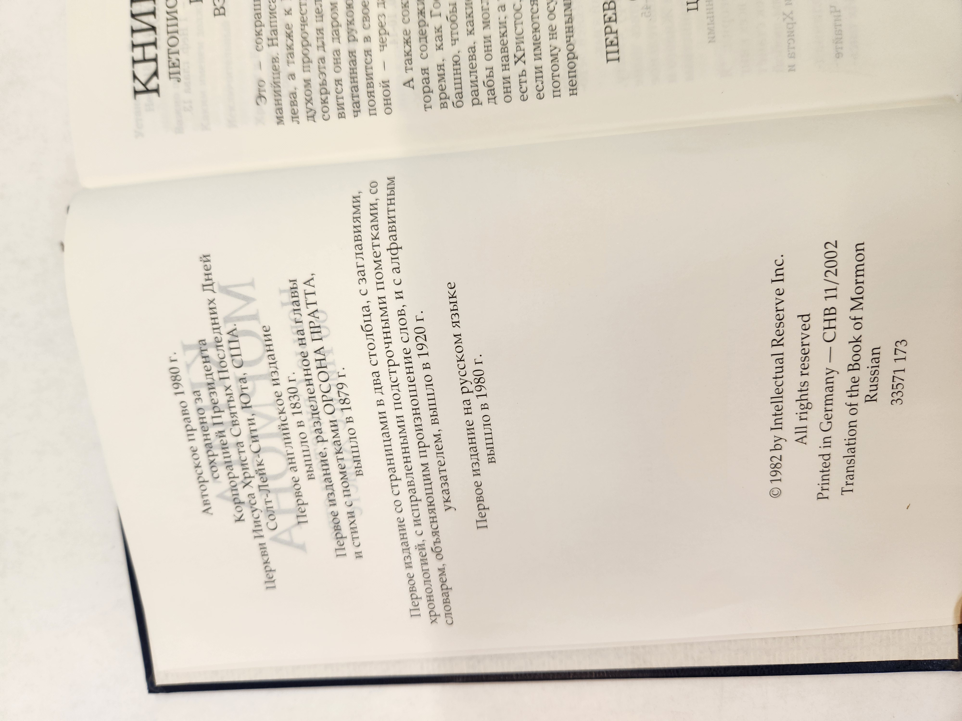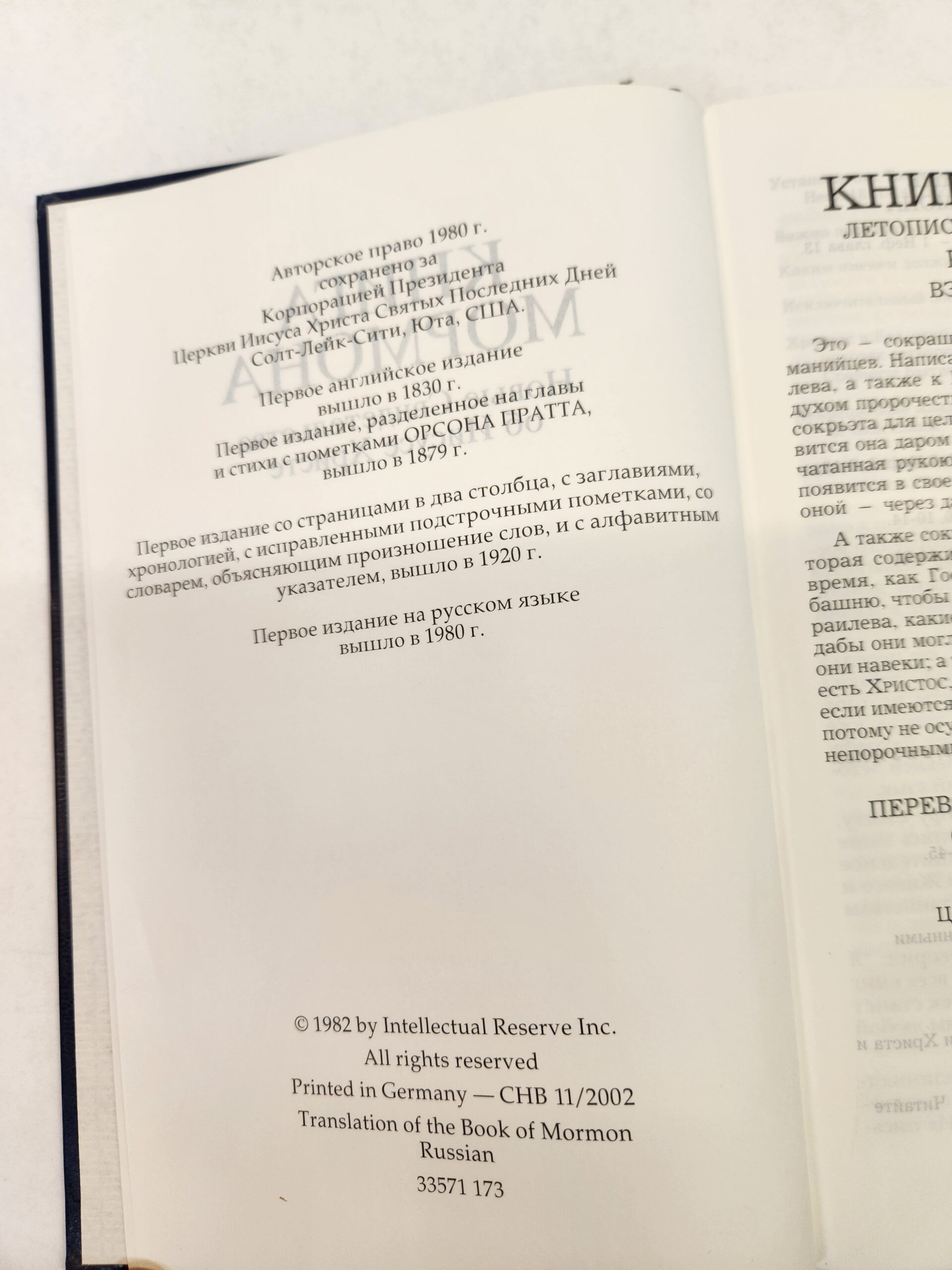 The Book of Mormon in Russian (2002, Hardcover) No marks/writing on pages. Corners and edges show some shelf wear with scuff/dent/bent marks. Binding is good. Cover, front and back has some smudge marks. Back cover and inside of back cover is a selling sticker.
