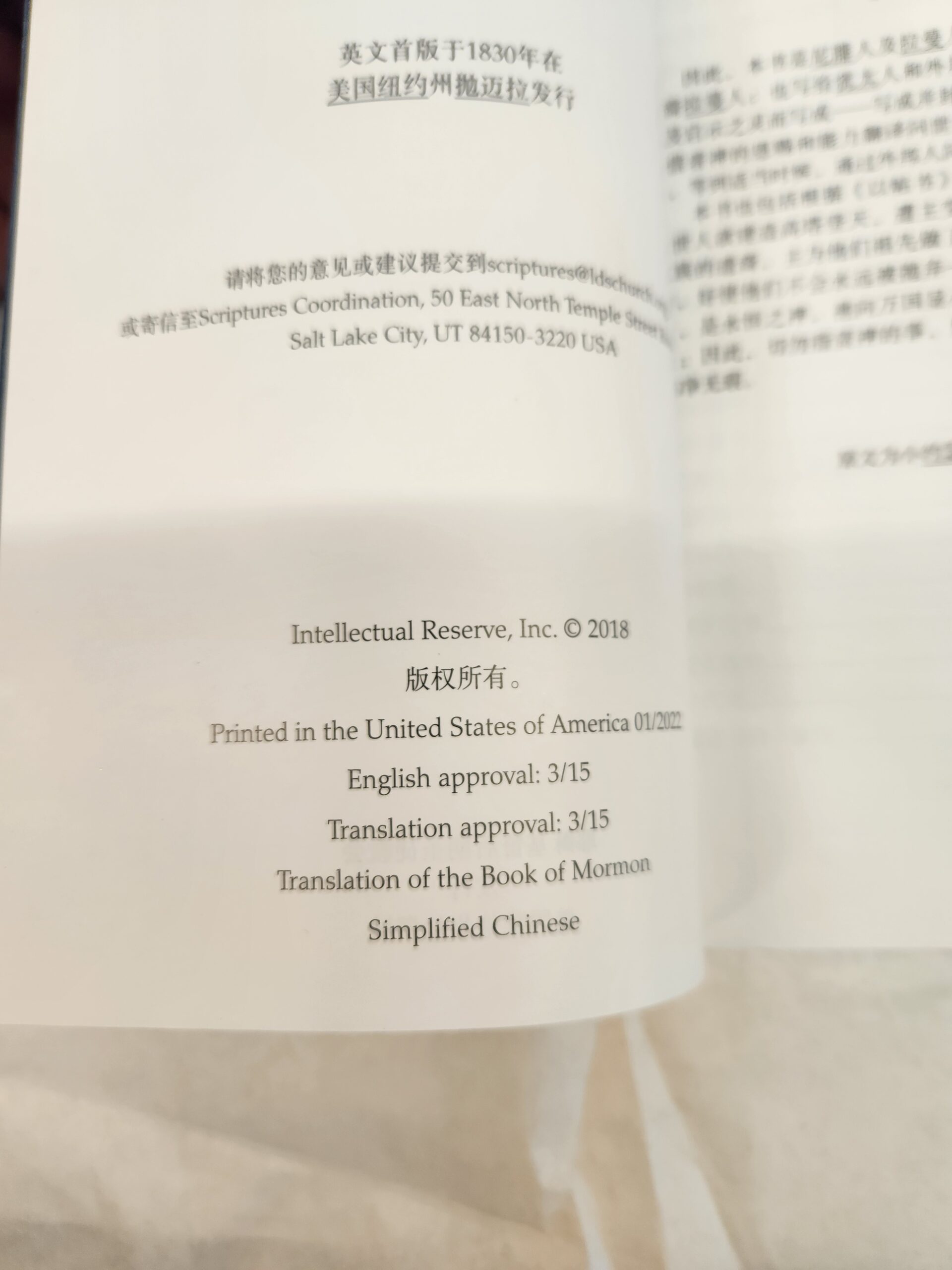 The Book of Mormon (Translation of the Book of Mormon into Simplified Chinese, 2022, Softcover) 2015 edition but printed in 2022. No marks or writing on pages. Back cover has a couple diagonal bend marks. Binding is good. Cover, front and back, has some light smudges.