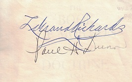 Heavily worn brown Triple Combination. Signed by both LeGrand Richards and Paul Dunn on the first blank page; some pages have markings and one page is about a third missing.