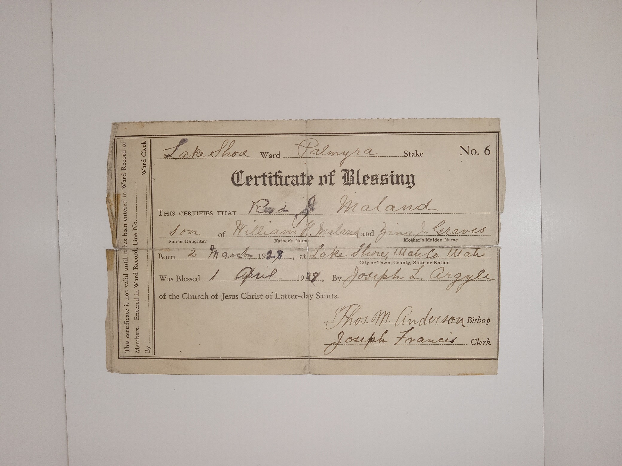 Mormon Certificate of Blessing Given to Reed J. Maland
