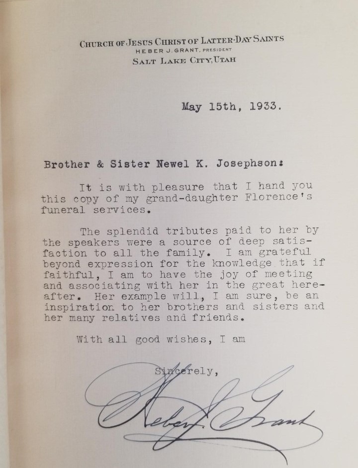 Letter tipped inside front cover is addressed to Brother and Sister Newel K. Josephson. The letter is then signed by Mormon Church President Heber J. Grant.