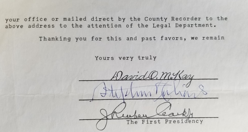 This two page letter is stapled together and a bit wrinkled; but it is signed by the First Presidency: David O. McKay, Stephen L. Richards, and J. Reuben Clark.