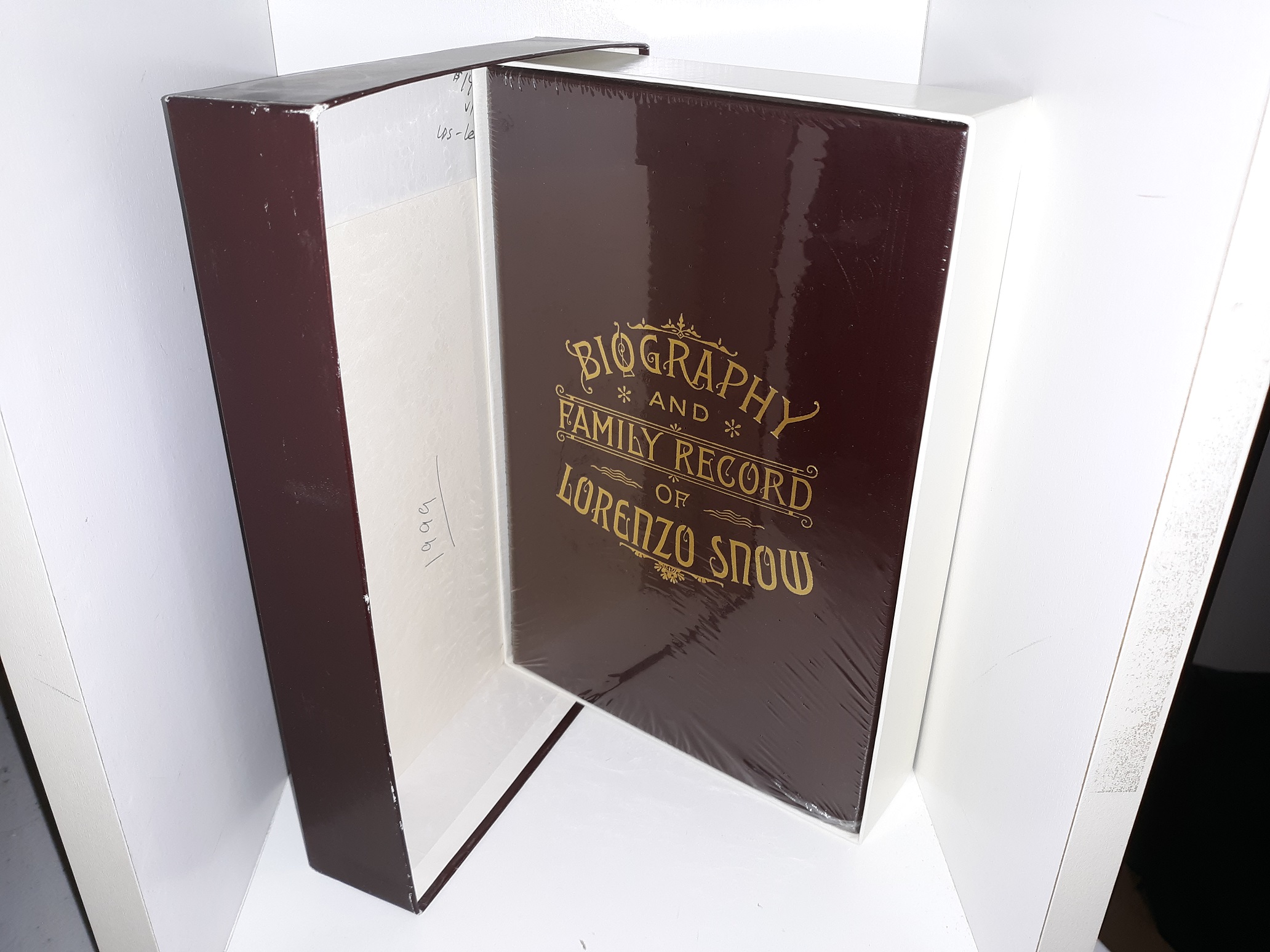 Brand new, burgundy, leather-bound book kept within its original, unopened plastic wrap and box. The box has scuffing and some tears, along with some writing in pencil on the inside. The book is in pristine condition beneath its plastic wrap.