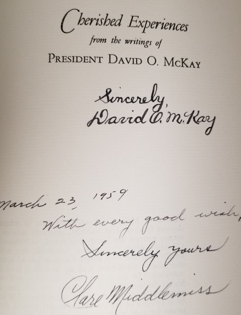 Hardbound with fair dust jacket; name inked inside front cover; inscribed and signed by David O. McKay, and by the compiler, Clare Middlemiss! Clean text; nice copy overall with good to fair dust cover.