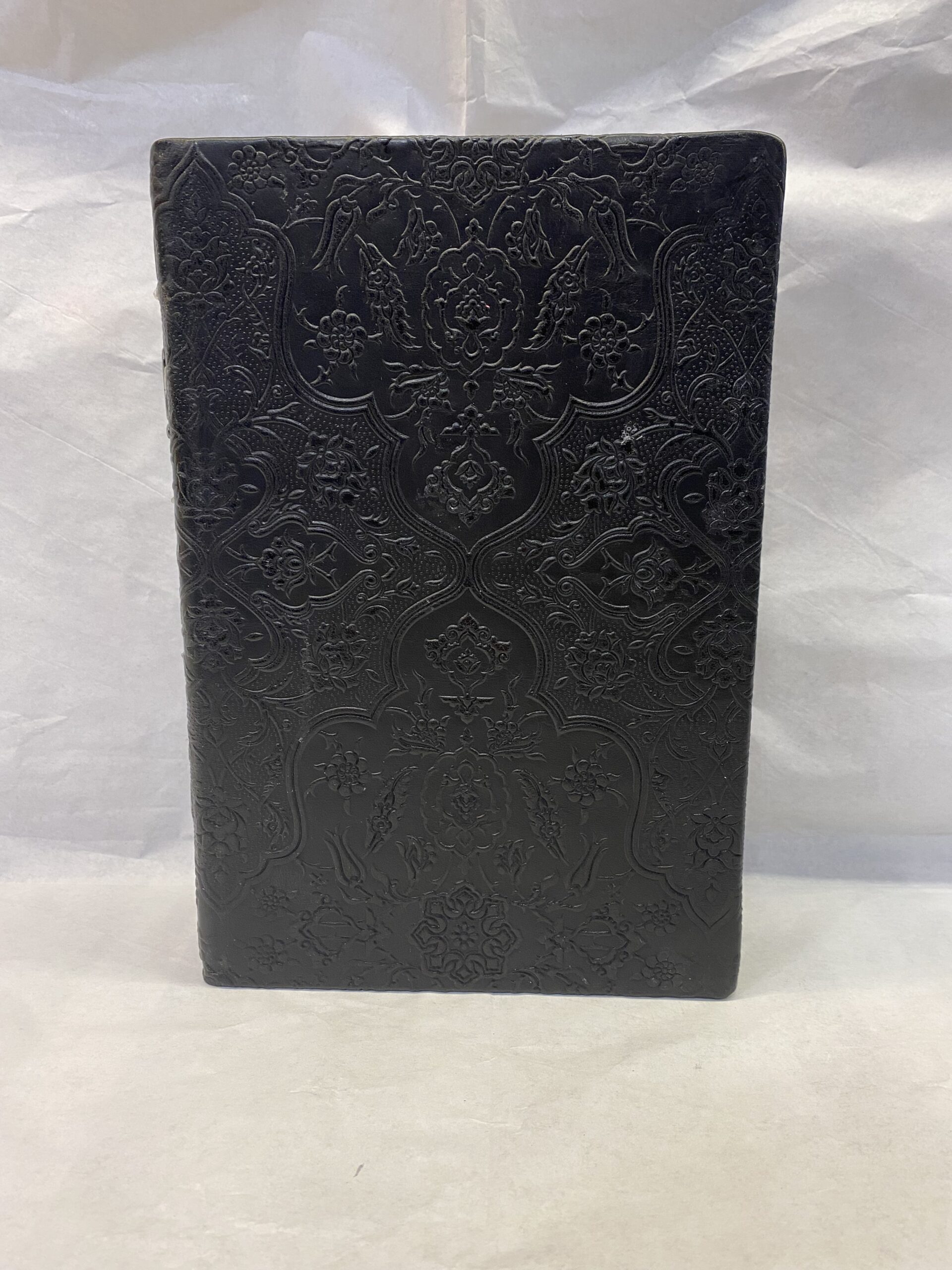 Acceptable condition. The leather cover has scratches, scuffs, some tears, smudges, and the letters are loose/coming off. The pages are warped/creased due to severe water damage. Many of the pages are torn with some stains, smudges, and a few pages have some pieces of paper glued in. The binding is loose. The edges of the pages are heavily scuffed, with smudges and scratches.