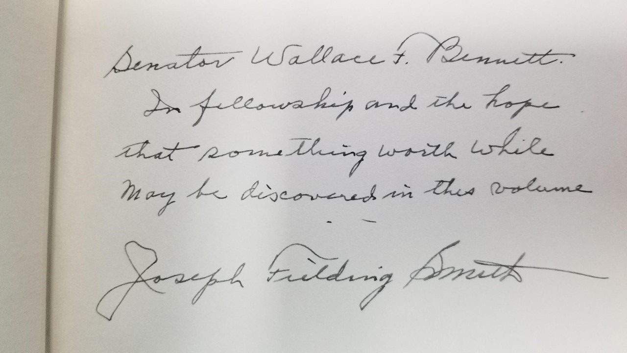 All three inscriptions state: “Senator Wallace F. Bennett, In fellowship and the hope that something worth while may be discovered in this volume.”
