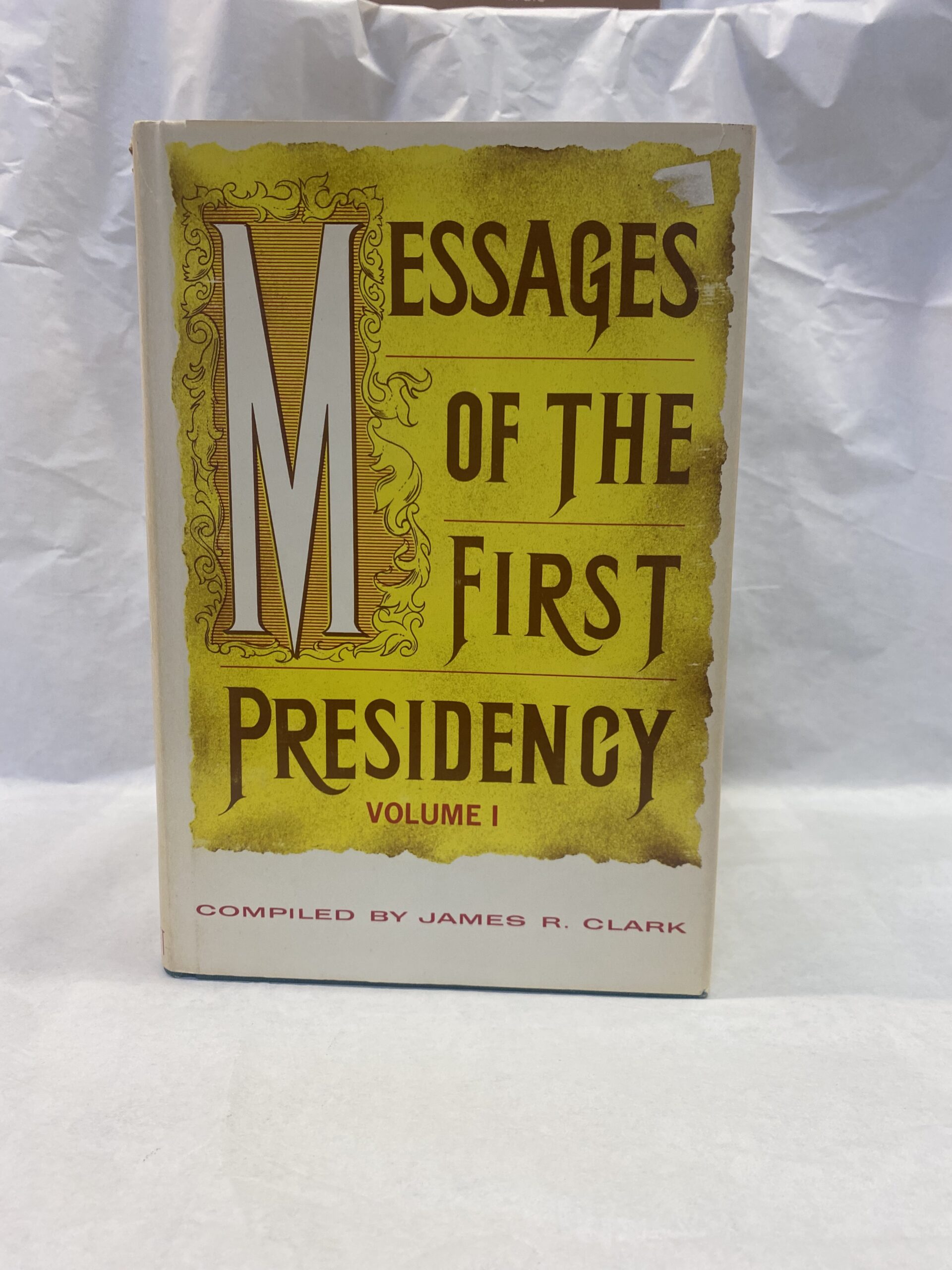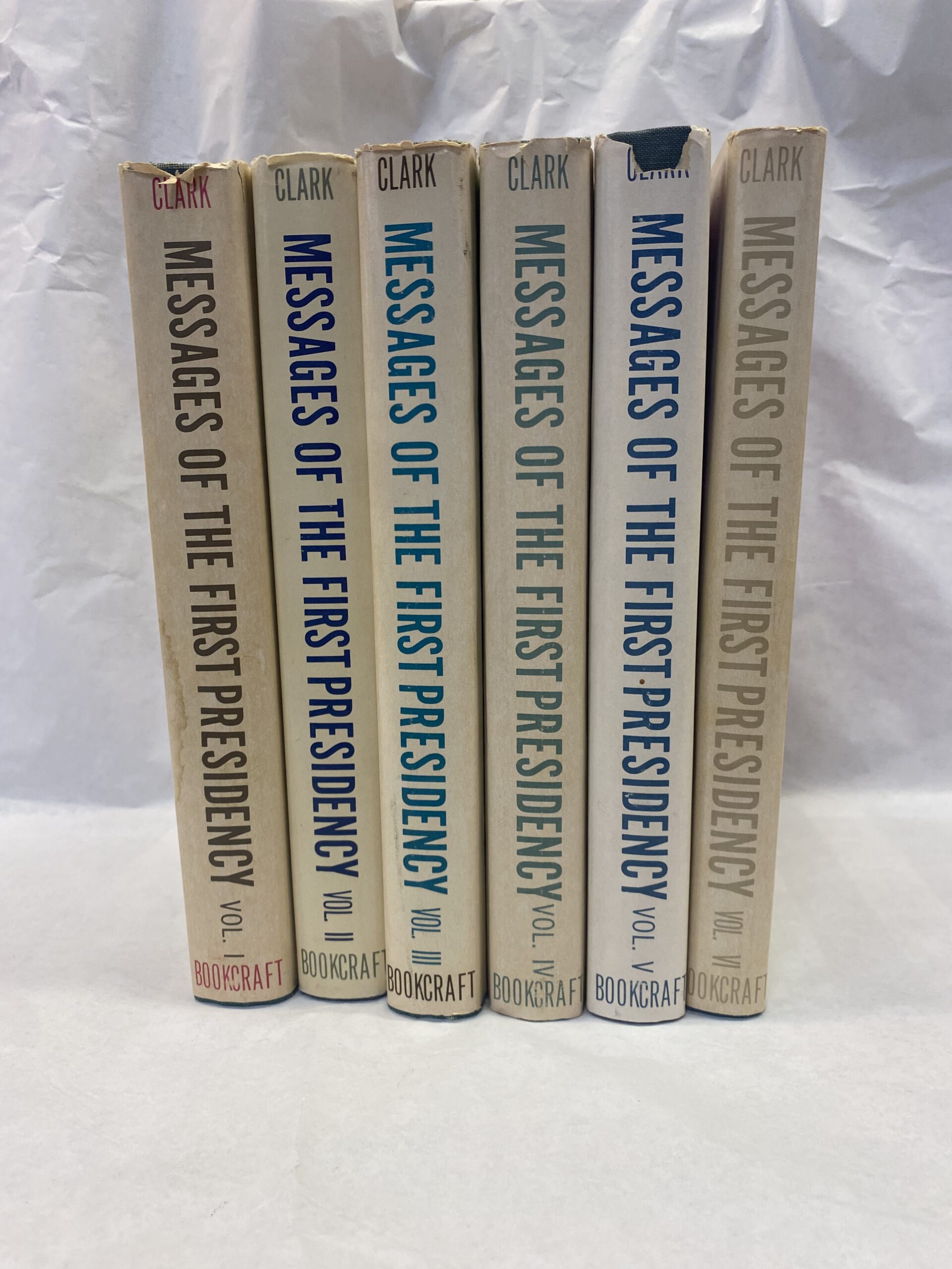 Messages of the First Presidency 6 Volume Set Compiled by James R. Clark. Hardcover with dust jacket, Volume 1, 4, and 6 were published in 1975, Volume 2 in 1965, Volume 3 in 1966, and Volume 5 in 1971.