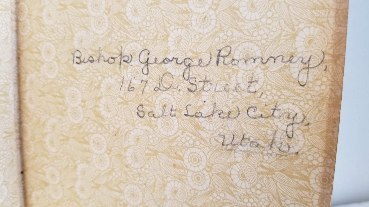 Small piece of paper included which appears to be a small note about a ward Sunday School from 1899, with the name Della Romney penciled on it.