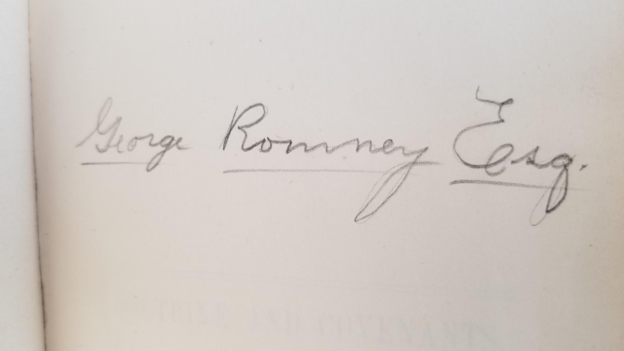Raised bands on the spine. Inscriptions by a Bishop George Romney, undoubtedly a relative of Mitt Romney, but not sure if it was his father, George Romney.