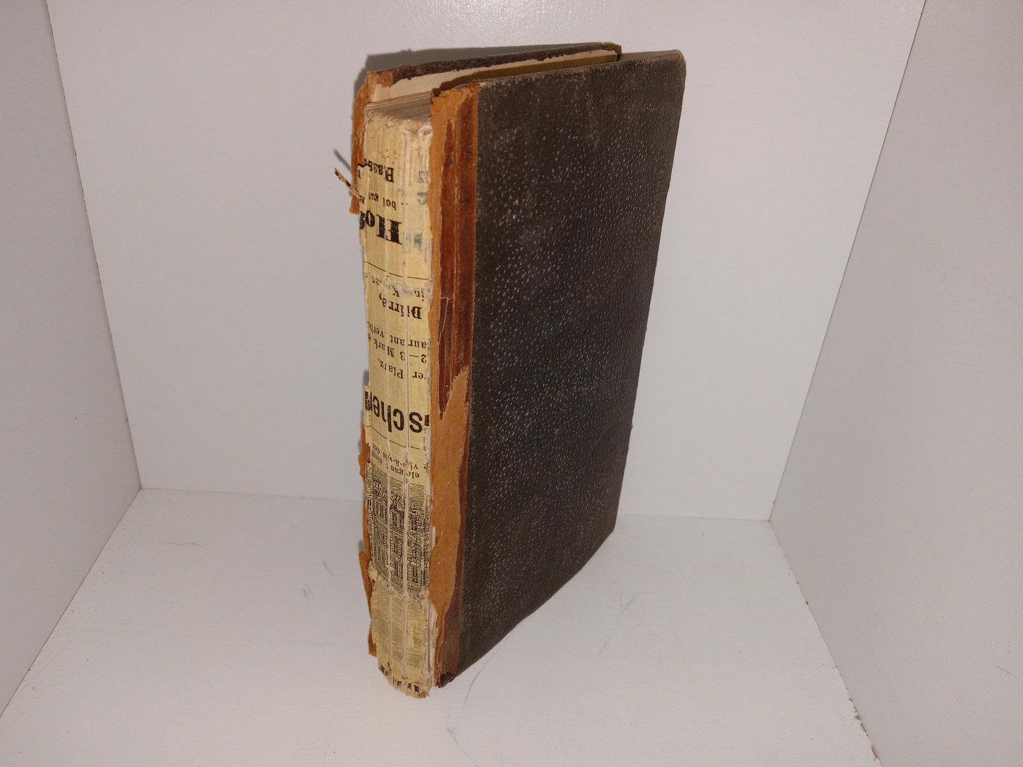 Fair condition, small hardcover with the spine torn off, but the binding still present, with the front cover still partly attached to the binding, and the back cover being detached from the binding. The covers also has fading, scuffing, tears, peeling, pieces torn off, and fraying. The front inside cover has some tape, stains, and an ink stamp. Some pages have stains, tears, or creases. The internal binding is torn and loose.