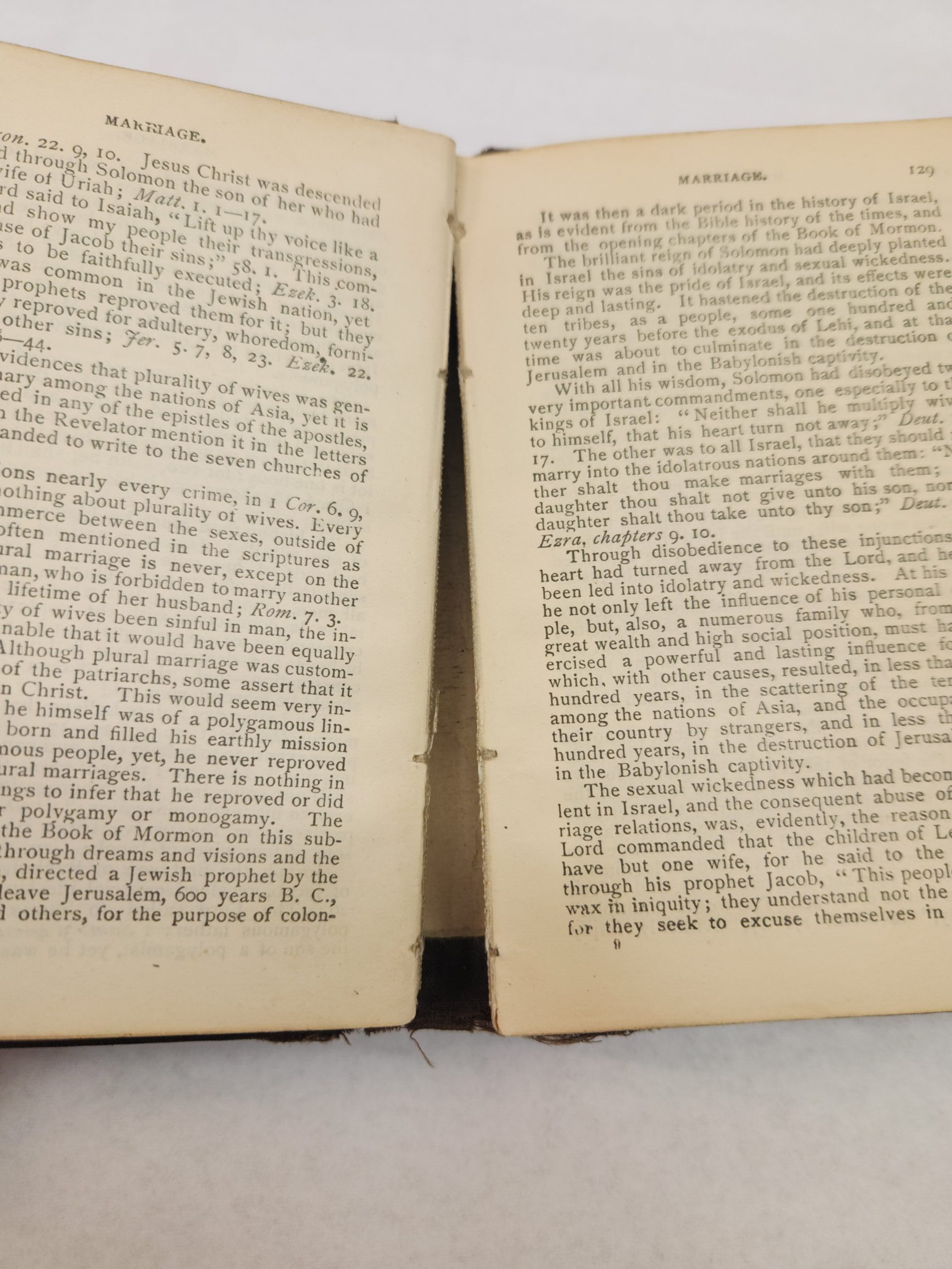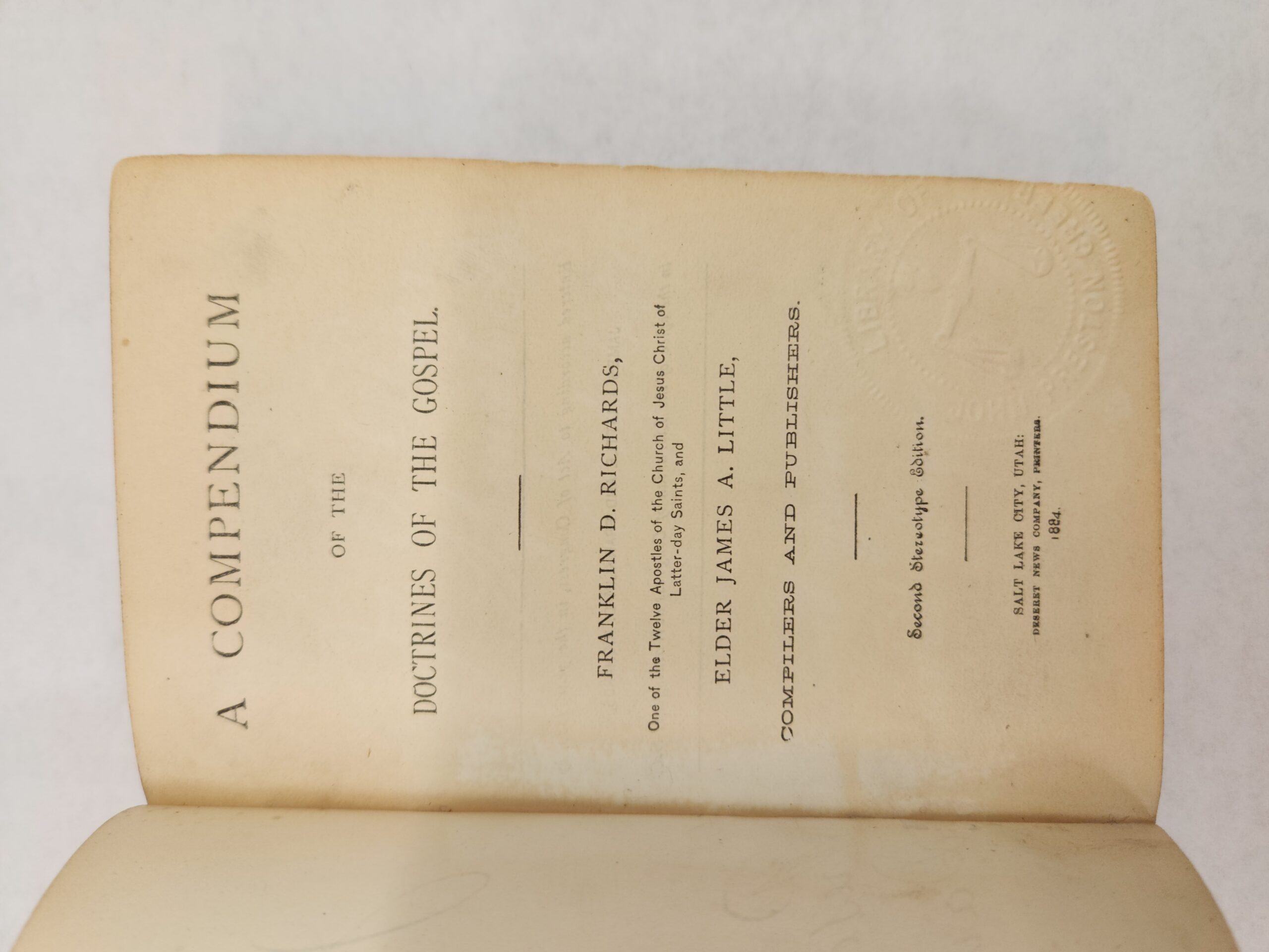 A Compendium of the Doctrines of the Gospel (1884, Hardcover) The binding is broken in a few spots but all the pages are holding within the book. There is no writing on the pages, except for the first page/inside front cover. Corners and edges show great shelf wear. Cover shows some wear with light scratch marks, scuffs, and rub marks.