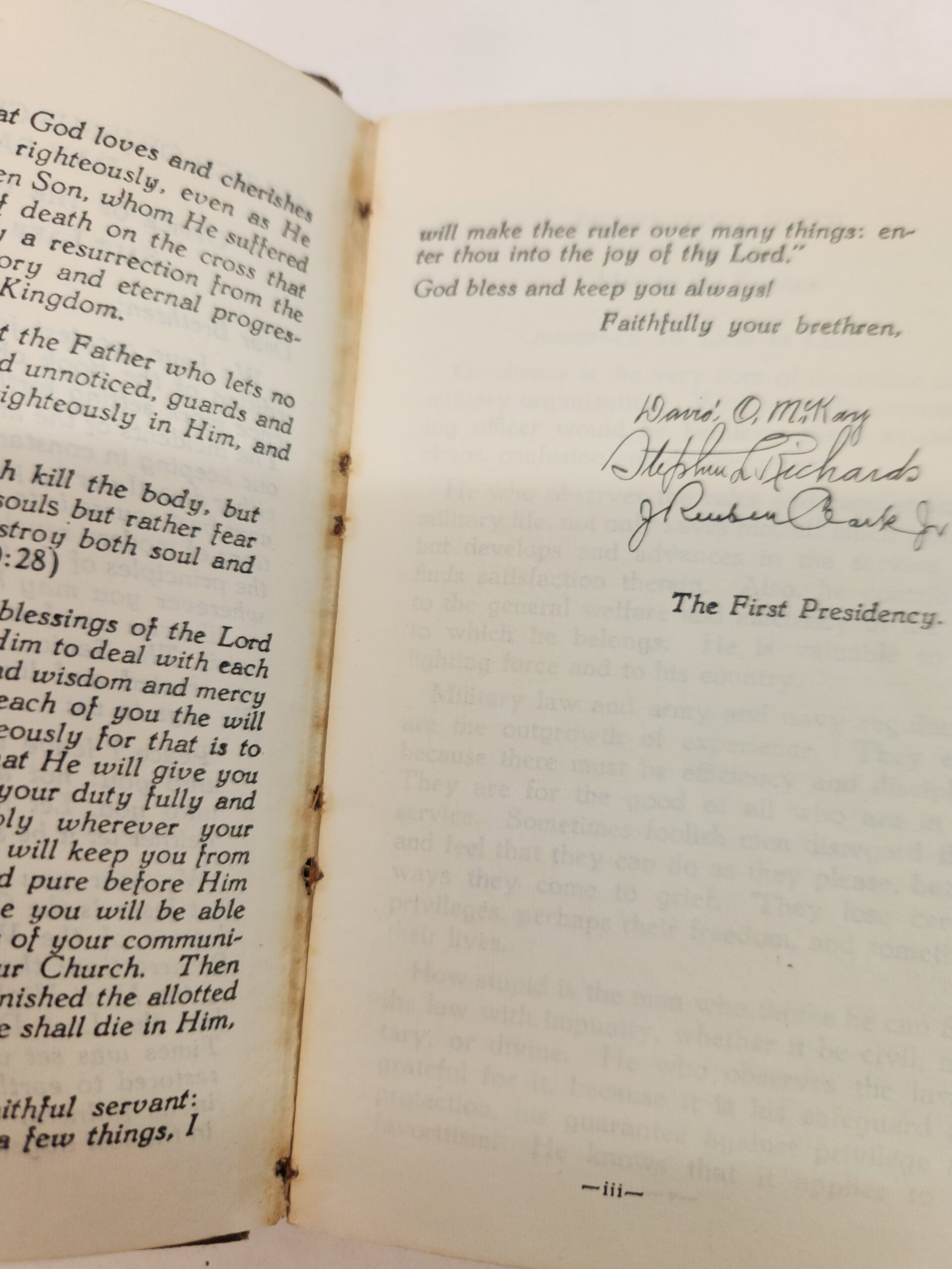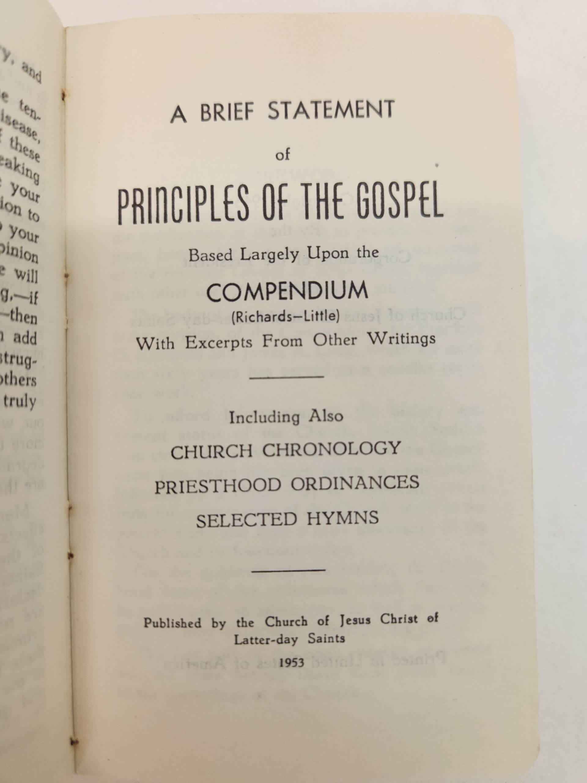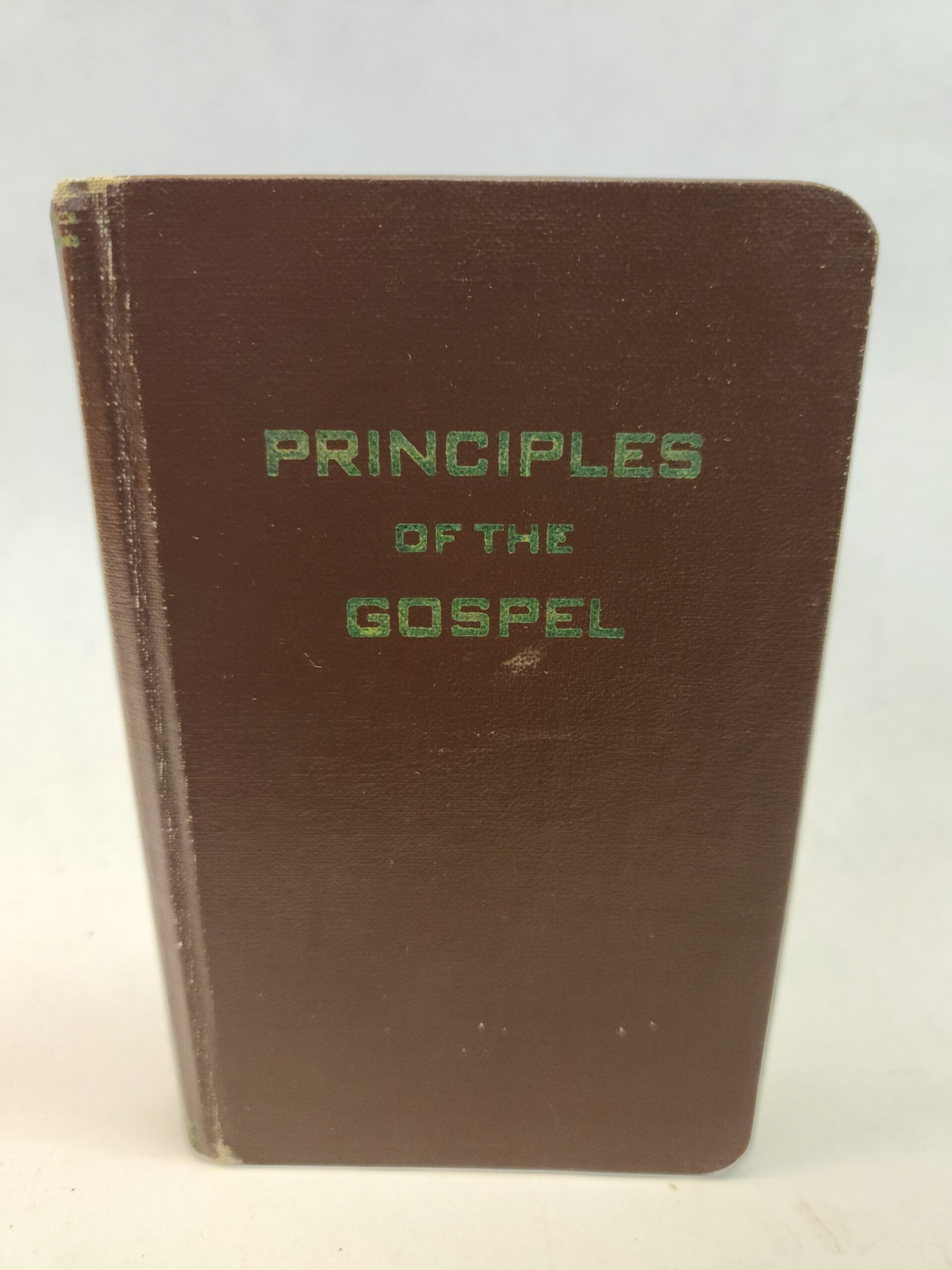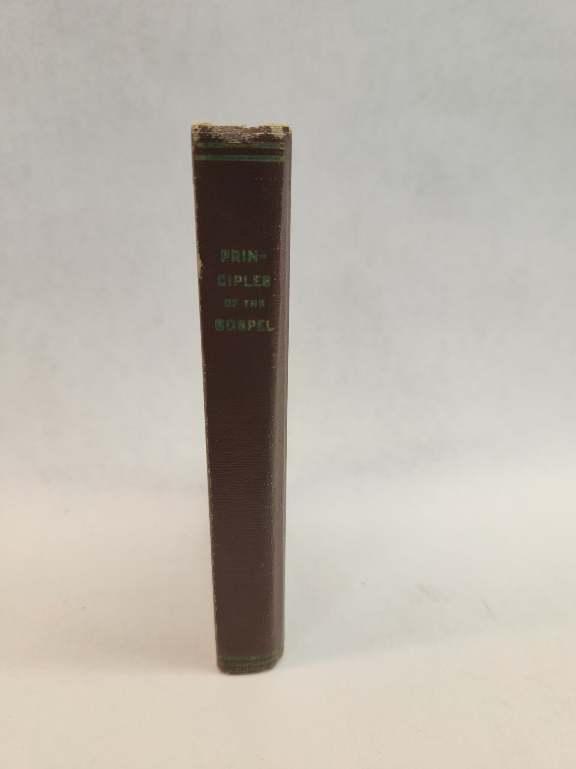 Principles of the Gospel (1953, Hardcover) No writing/marks on pages, except for on the inside of front cover is written a name in pen. Corners and edges show some shelf wear with scuff marks and bends on the top an bottom of spine. Binding is still holding but beginning to loosen. Front cover has a smudge mark.