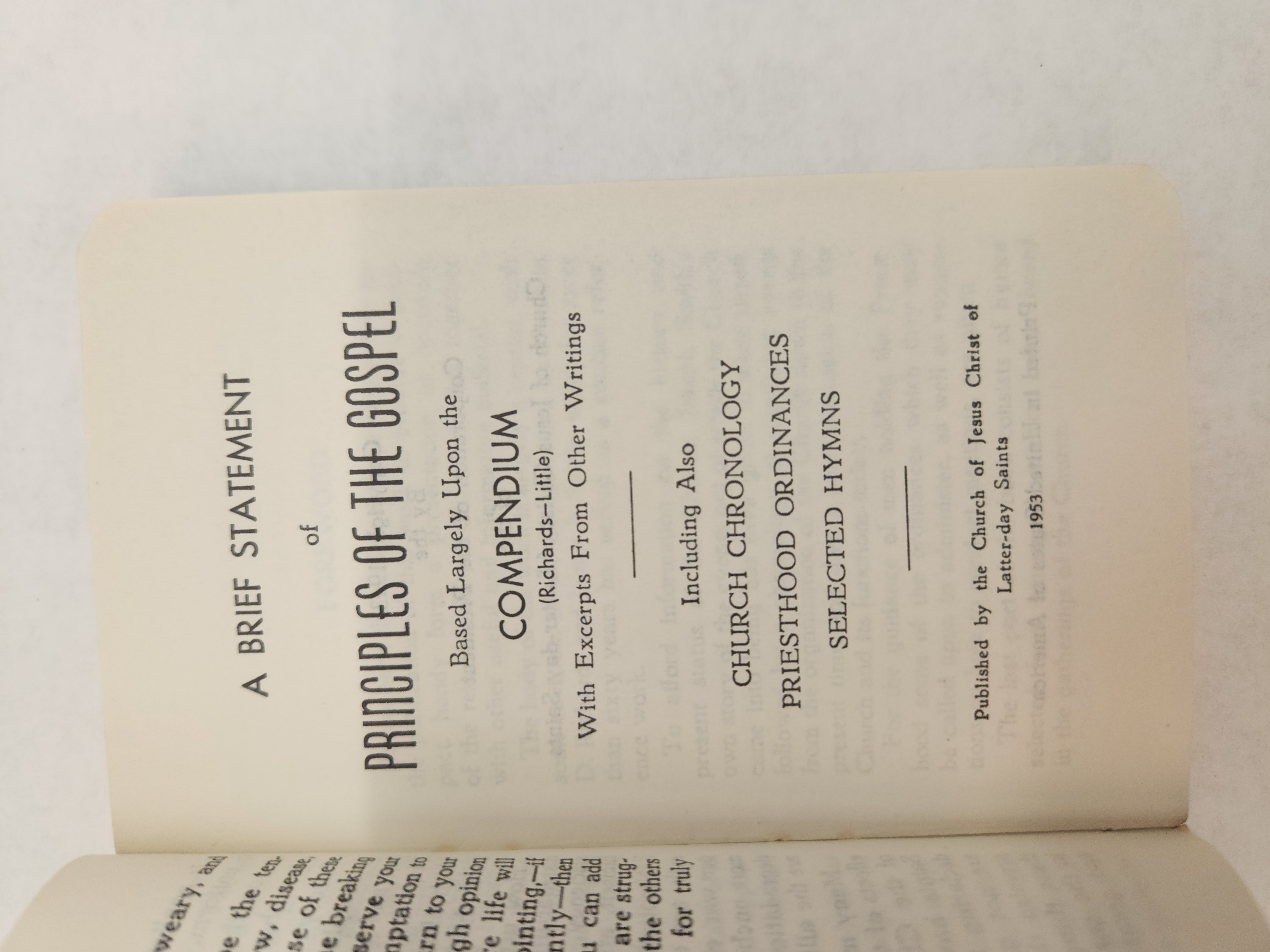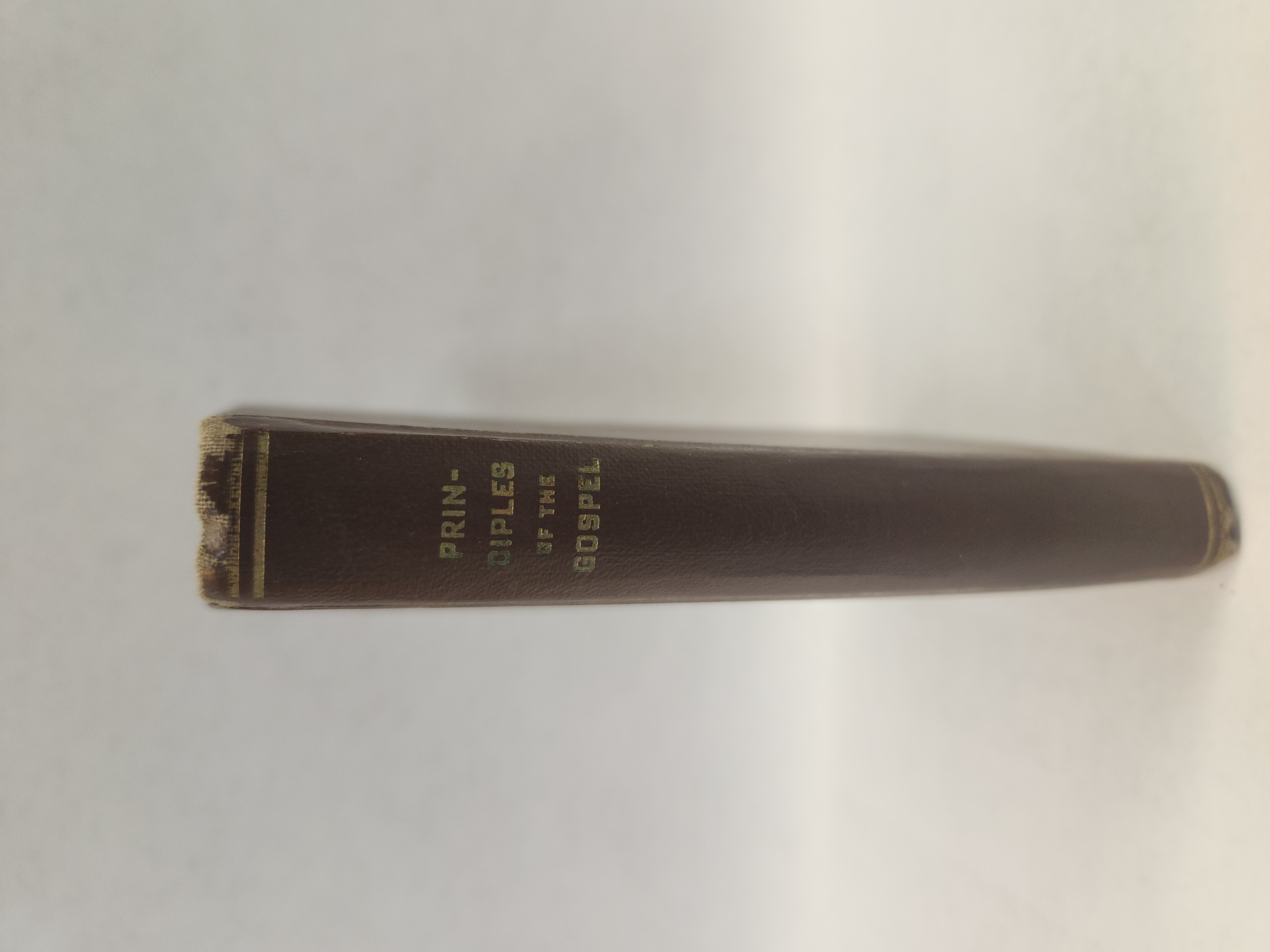Principles of the Gospel (1953, Hardcover) No writing/marks on pages, except for last blank page (see pic in gallery). Binding is good. Corner and edges show moderate shelf wear. Cover has a few dent marks and smudge marks.