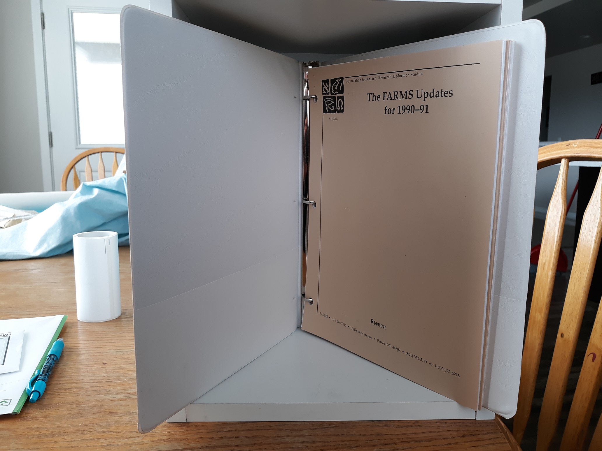 A set of loose-leaf sheets within a thin, white binder. The first page has writing in pencil. Text throughout is clean, clear, and legible……………………….v1 Bx1586