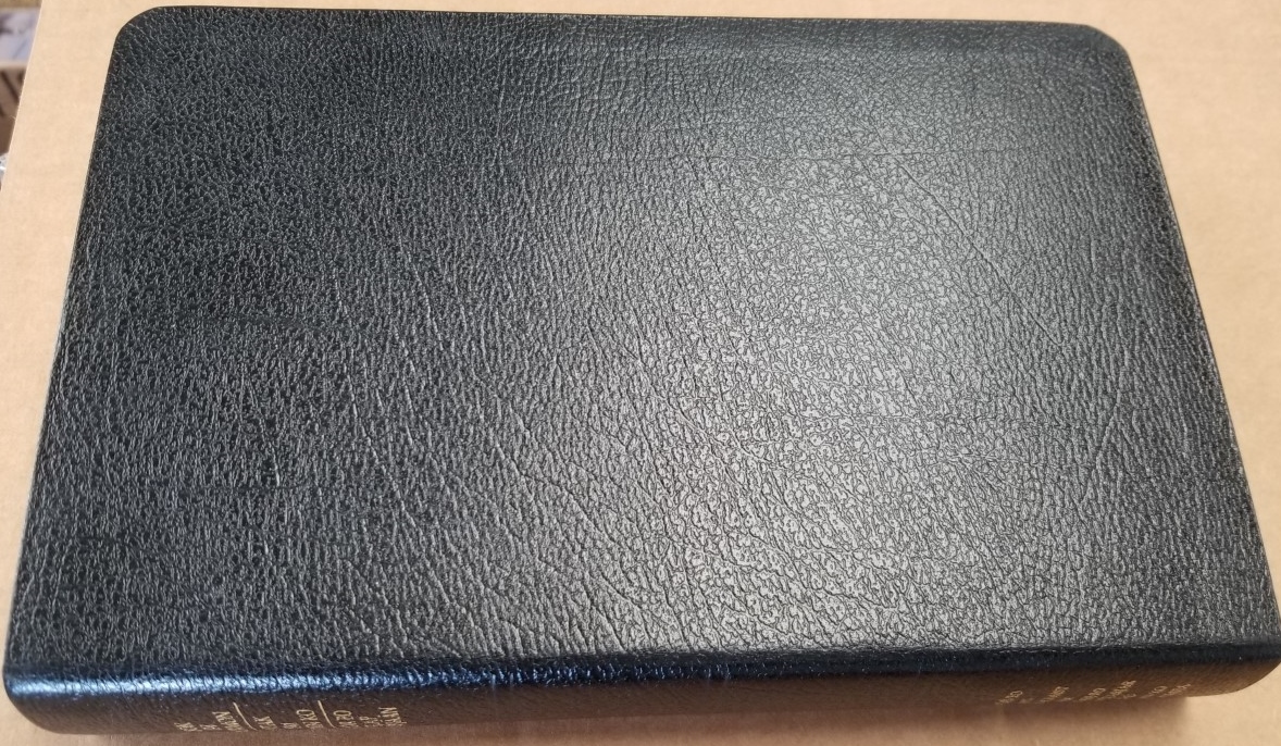 Nice leather-like black bendable book; gold leafed page edges; very nice; small ink inscription inside the front cover.