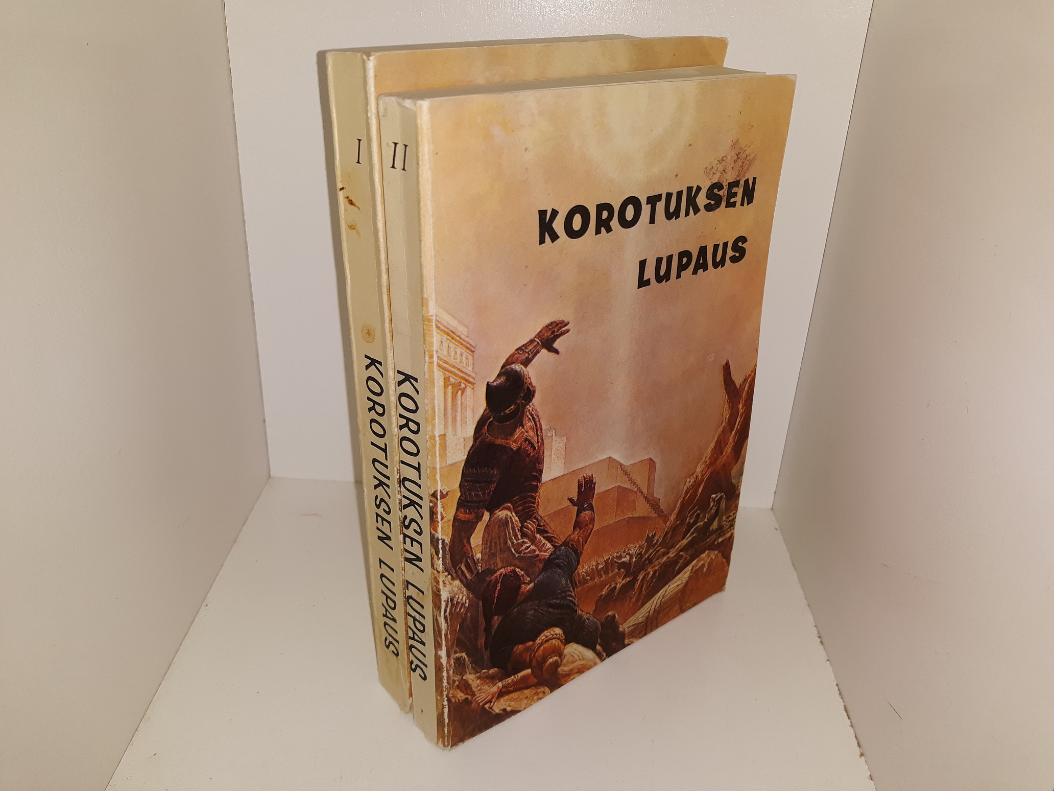 2 fair condition softcovers with white spines. The covers have stains, adhesive residue, scuffing, small tears, and some minor creasing at the edges. Some pages have stains. The internal binding is torn, causing the first 5 pages have been mostly detached from the binding. The front inside covers have writing in pen. The front flyleaves have writing in pencil and eraser marks.