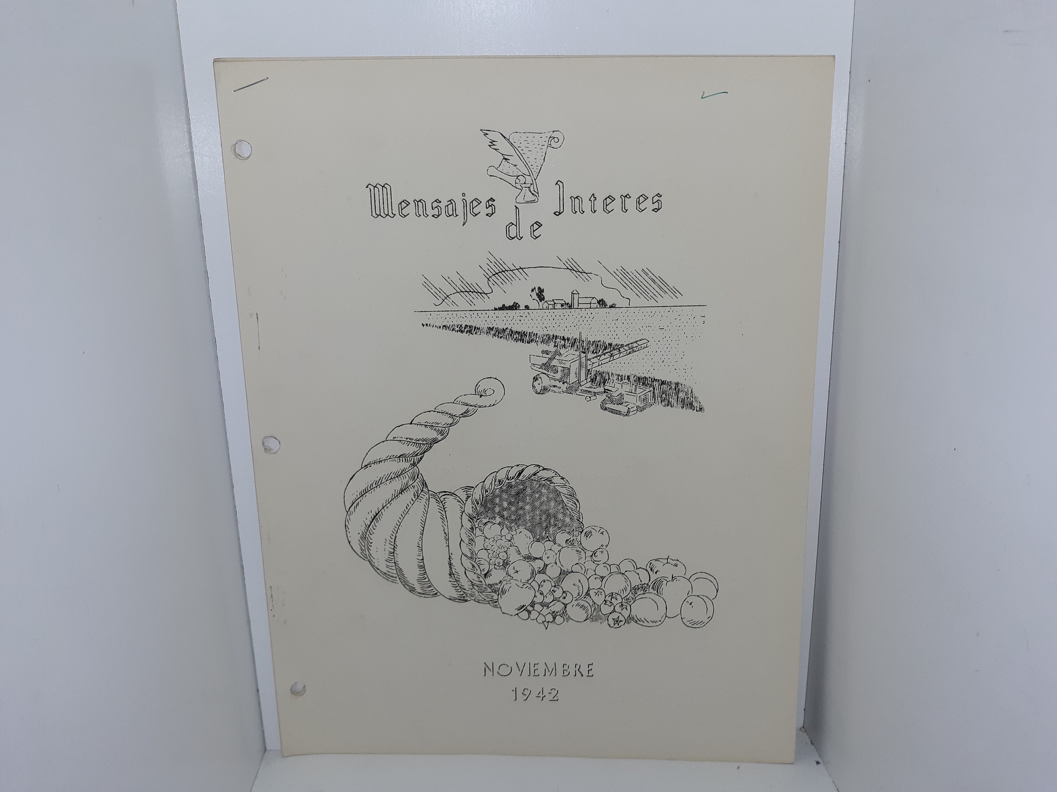 Fair-good condition, large, thin, off-white softcover with 3 holes punched near the spine, and a single staple binding at the top corner. The cover and pages all have some minor pen marks, and some tiny holes and dents where staples were removed. The edges of some of the holes punched have some small tears. The first page has writing in pencil.
