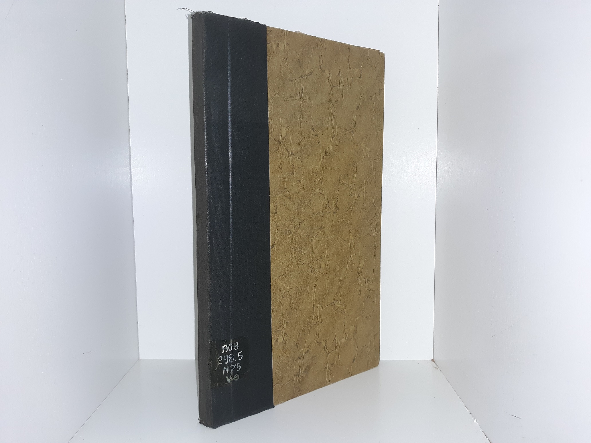 Fair condition, hardcover with a black spine and no dust jacket. The cover has writing in white pen, some smalls stains, and fraying. The inside front cover has a large sticker. Pages throughout are stained and have some tears at the edges. The first page has writing in pencil and eraser marks.
