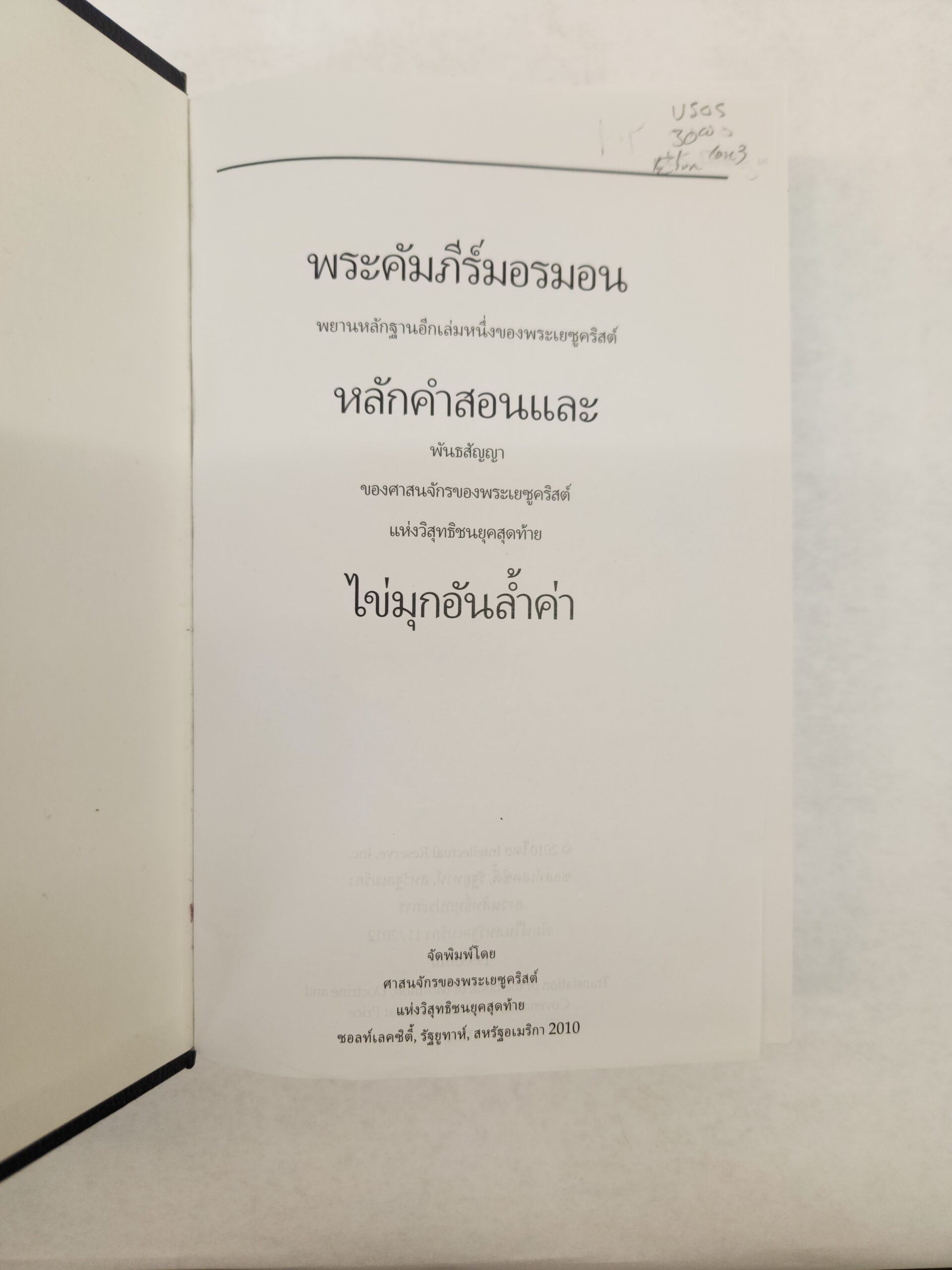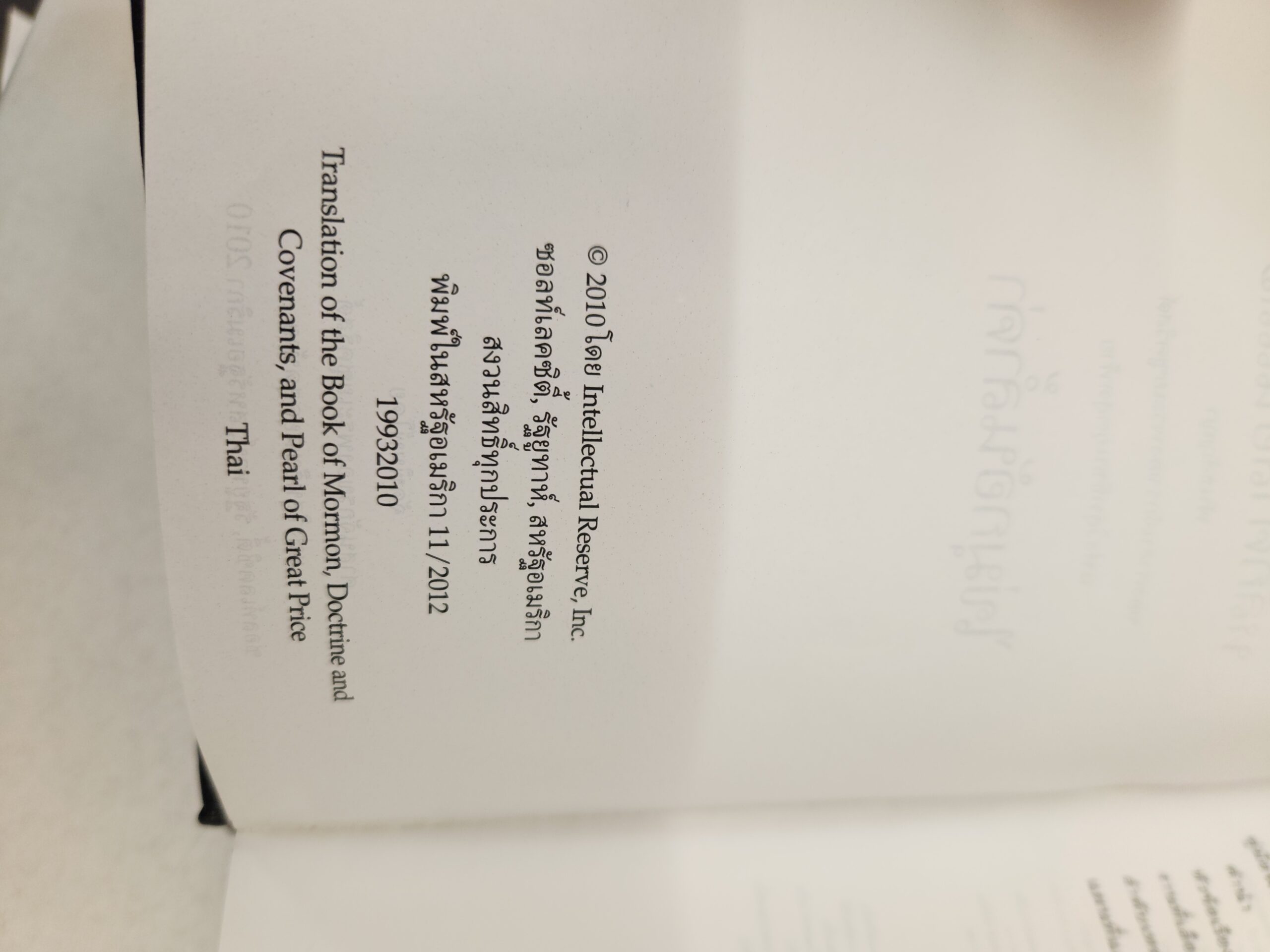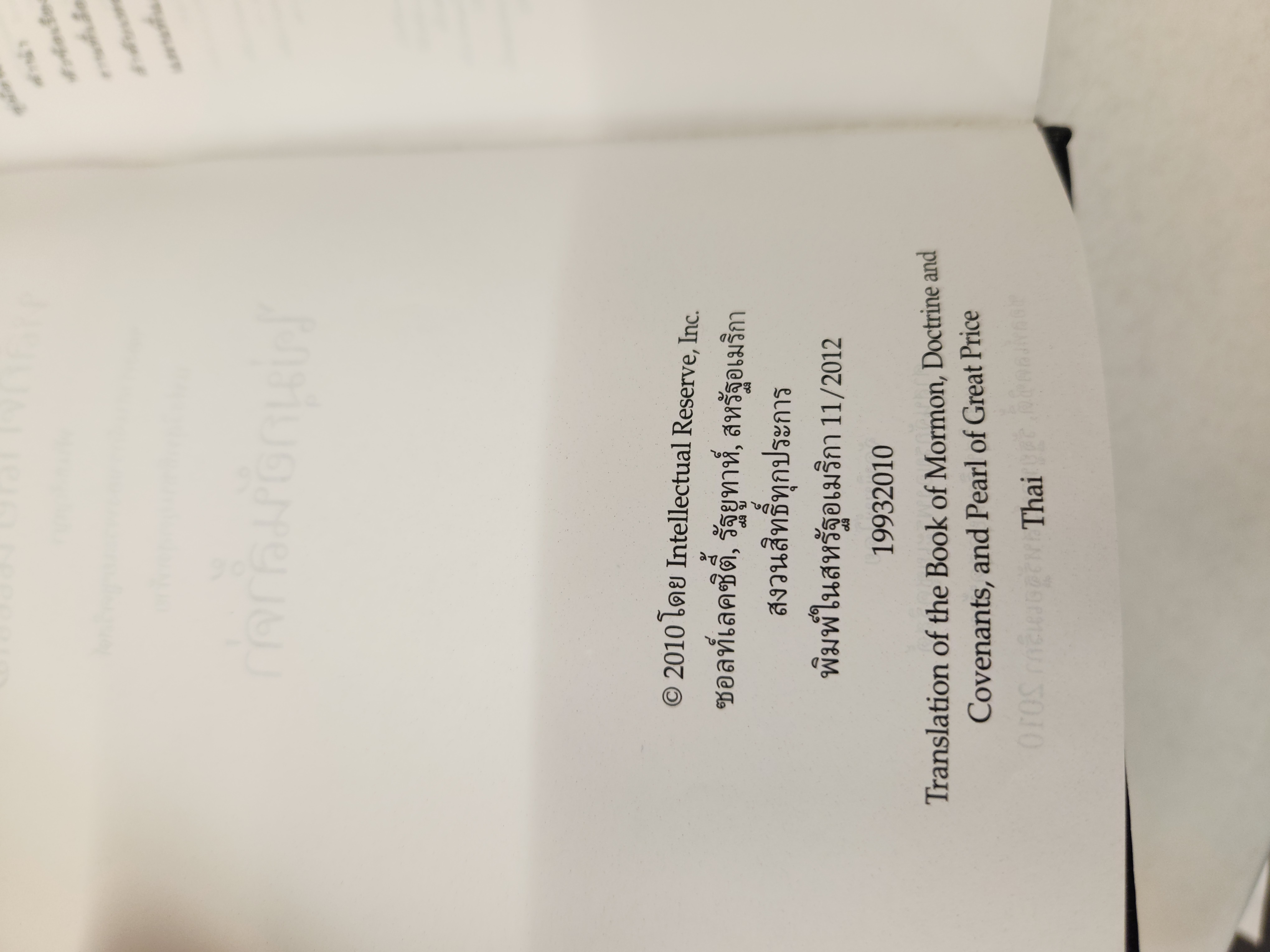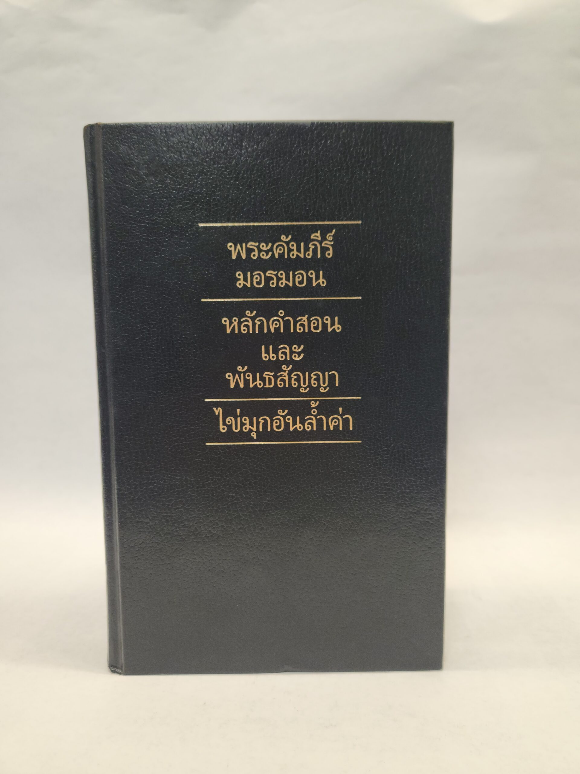 The Book of Mormon, Doctrine and Covenants, Pearl of Great Price (Thai, 2012, Hardcover) No marks or writing on pages. Corner and edges show little shelf wear, except for a dent in the bottom of front cover. Binding is good. Cover, front and back, has smudge marks.