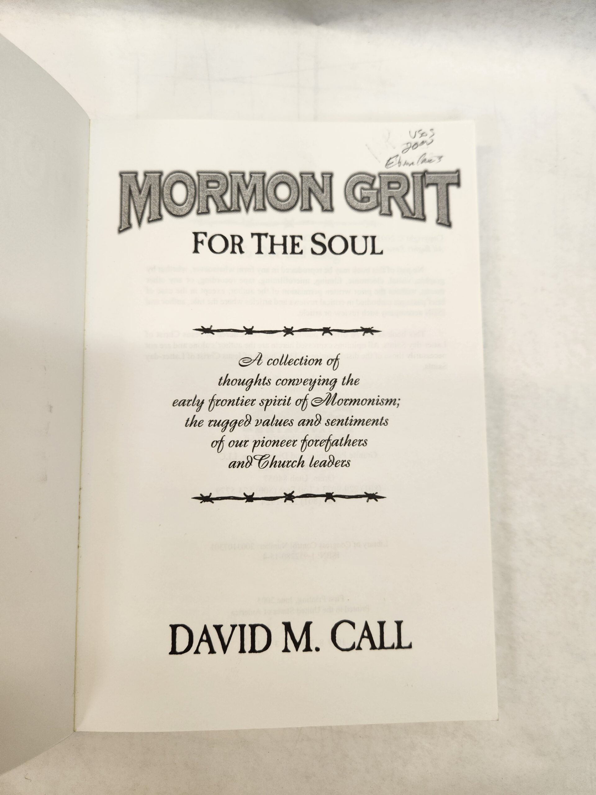 Mormon Grit:: For The Soul, A collection of thoughts conveying the early frontier spirit of Mormonism; the rugged values and sentiments of our pioneer forefathers and Church leaders (2003, Paperback) No writing/marks on pages. Corners and edges show some wear with light scuffs. Binding is good. Some sticker residue on top left corner of front cover. Cover, front and back, has some light scratch marks and light scuff marks.
