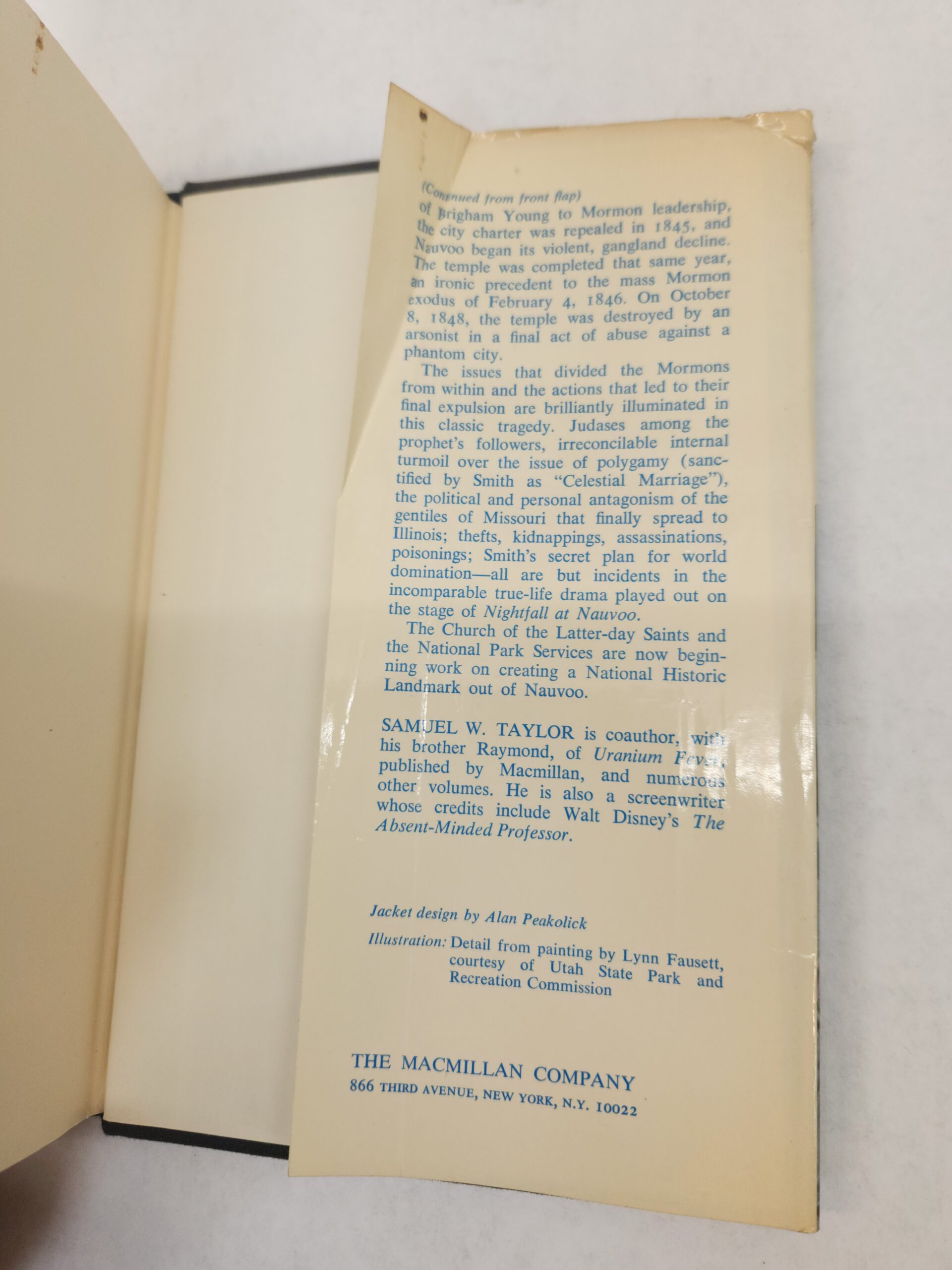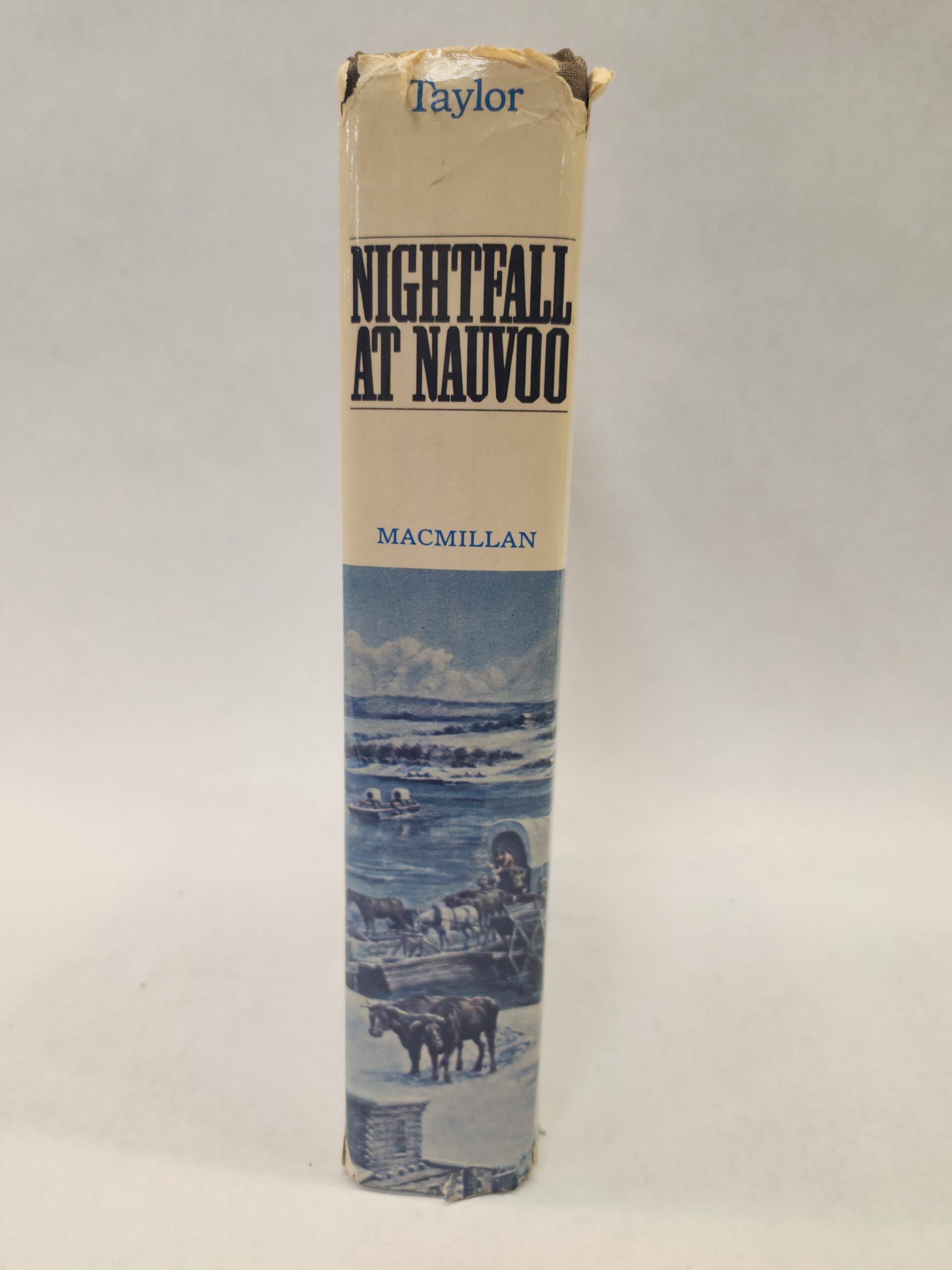 Nightfall at Nauvoo (1971, Hardcover w/ dust jacket) No writing/marks on pages except for the first page (see pic). Binding is good. Corner and edges, on both dust jacket and book, show shelf wear with dings, scuffs, worn marks, and dust marks. Dust jacket has several small tear marks along the edges. Red dot on top page edge end (see pic).