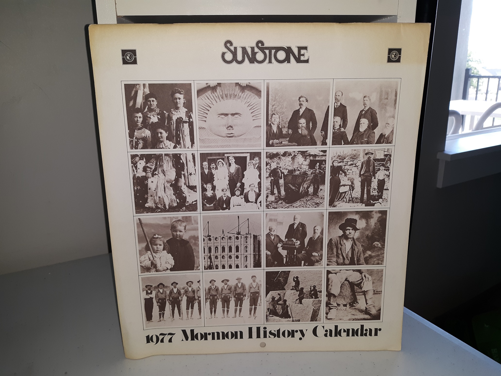 Good condition, large, off-white calendar. The cover has stains at the edges, a long scuff mark on the back, and some small tears and creasing at the edges. The first page has writing in pencil. Text and illustrations throughout are clean, clear, and legible.