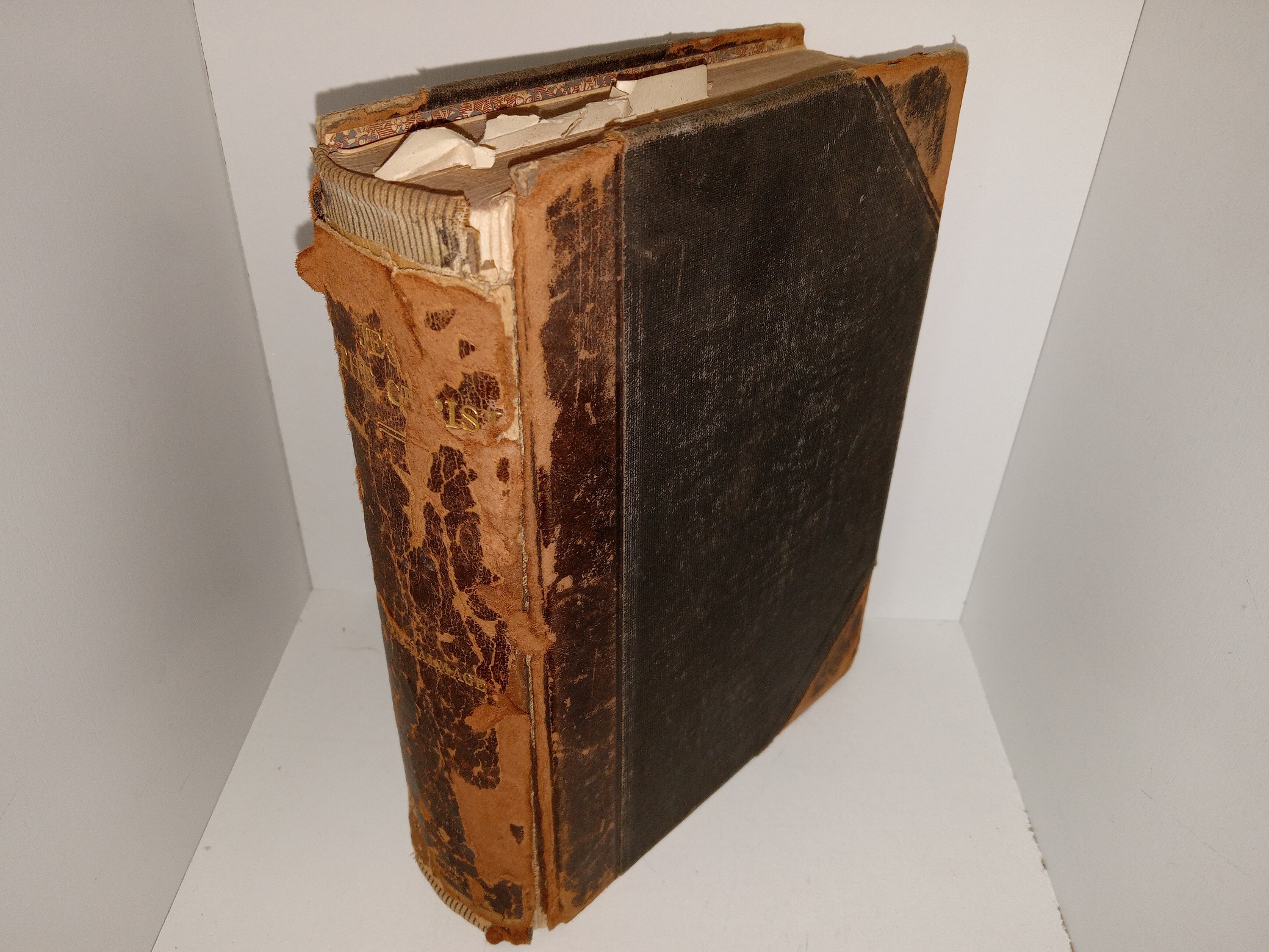 Fair condition, 3/4 leather, hardcover with no dust jacket. The leather of the spine and corners has large pieces torn off, tears, peeling, scuffing, scratches, and crushed corners. The inside covers and flyleaves have ink stamps, and writing in pen. The internal binding is torn and loose. The pages have stains, writing in pencil and eraser marks.