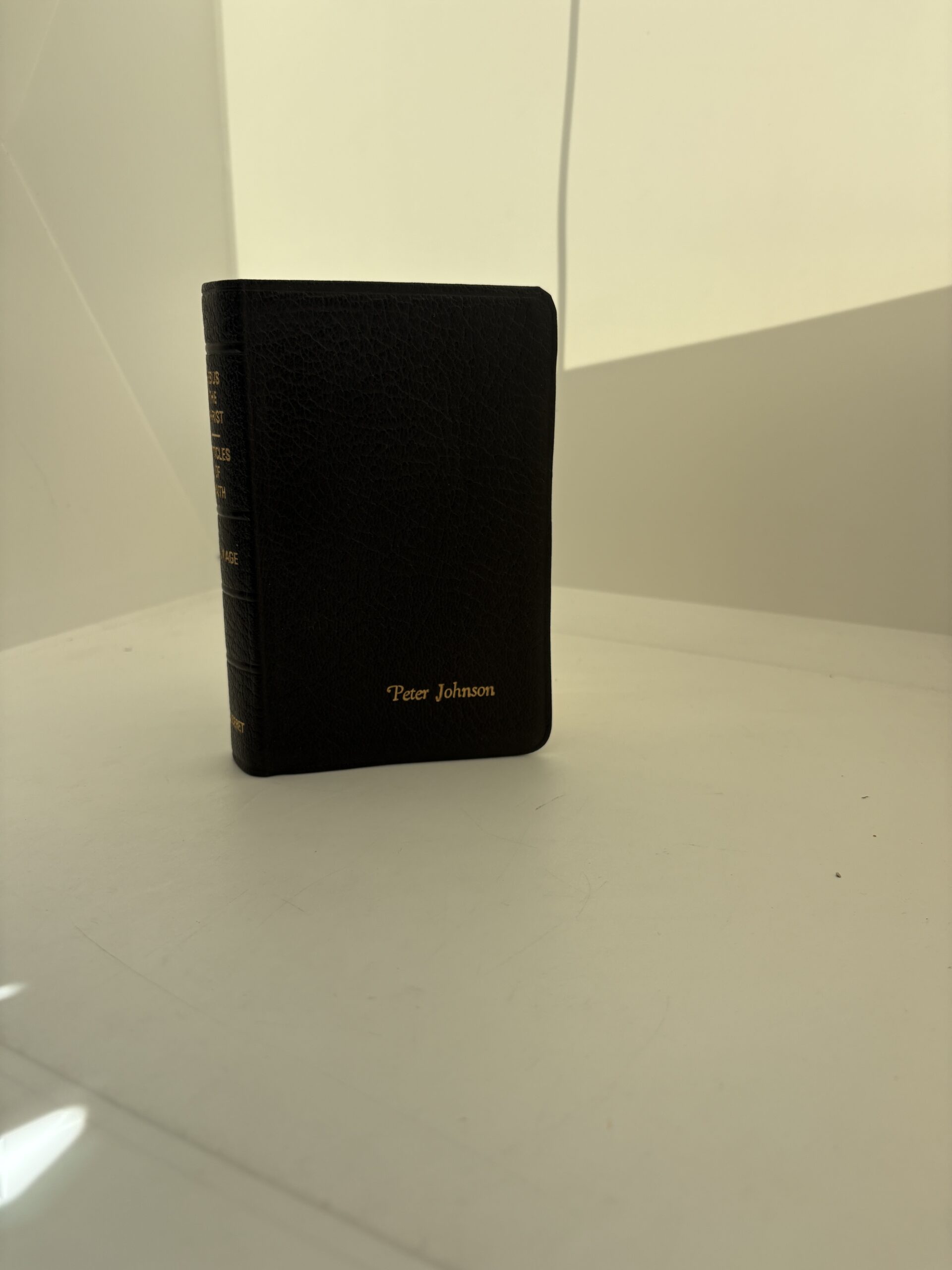 Very good condition, black, leather-bound book. The cover has some bits of residue. The title page has some writing and inscriptions in pen. Text throughout is clean, clear, and legible.
