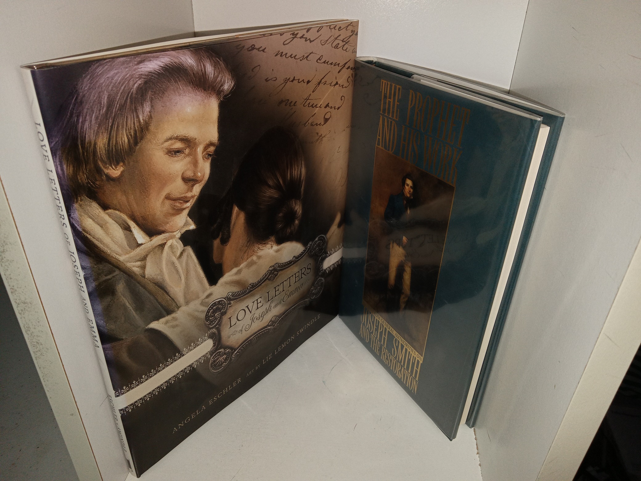 2 good condition hardcovers with dust jackets (1 large and thin, the other normal size and shape). The dust jackets have some pale scuff marks. The front flyleaf of The Prophet and His Work: Essays from General Authorities on Joseph Smith and the Restoration has writing in pencil. Text and illustrations throughout both books are clean, clear, and legible.