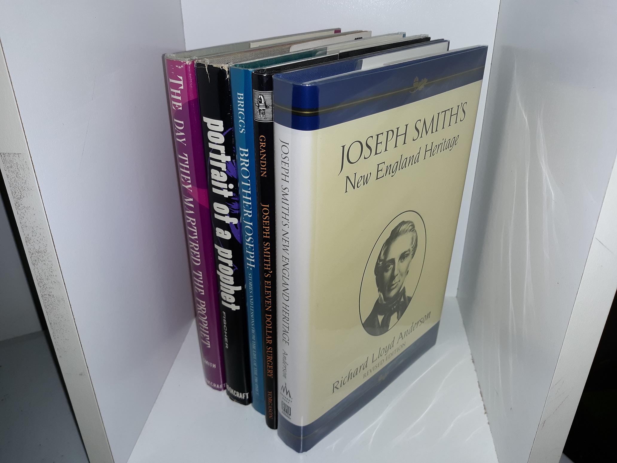 5 good-very good condition hardcover books with dust jackets, and three of them have mylar covers (Joseph Smith’s New England Heritage (Revised Edition), Brother Joseph: Stories and Lessons from the Life of the Prophet, and The Day They Martyred the Prophet: A Historical Narrative). The dust jackets of Joseph Smith’s Eleven-Dollar Surgery, Portrait of a Prophet, and The Day They Martyred the Prophet: A Historical Narrative have some small tears, and scuff marks. The dust jacket of The Day They Martyred the Prophet: A Historical Narrative has some small stains. The front flyleaf of Joseph Smith’s New England Heritage (Revised Edition) has writing in pencil. The front flyleaf of Portrait of a Prophet has an inscription written in pen. Text and illustrations throughout the books are clean, clear, and legible.