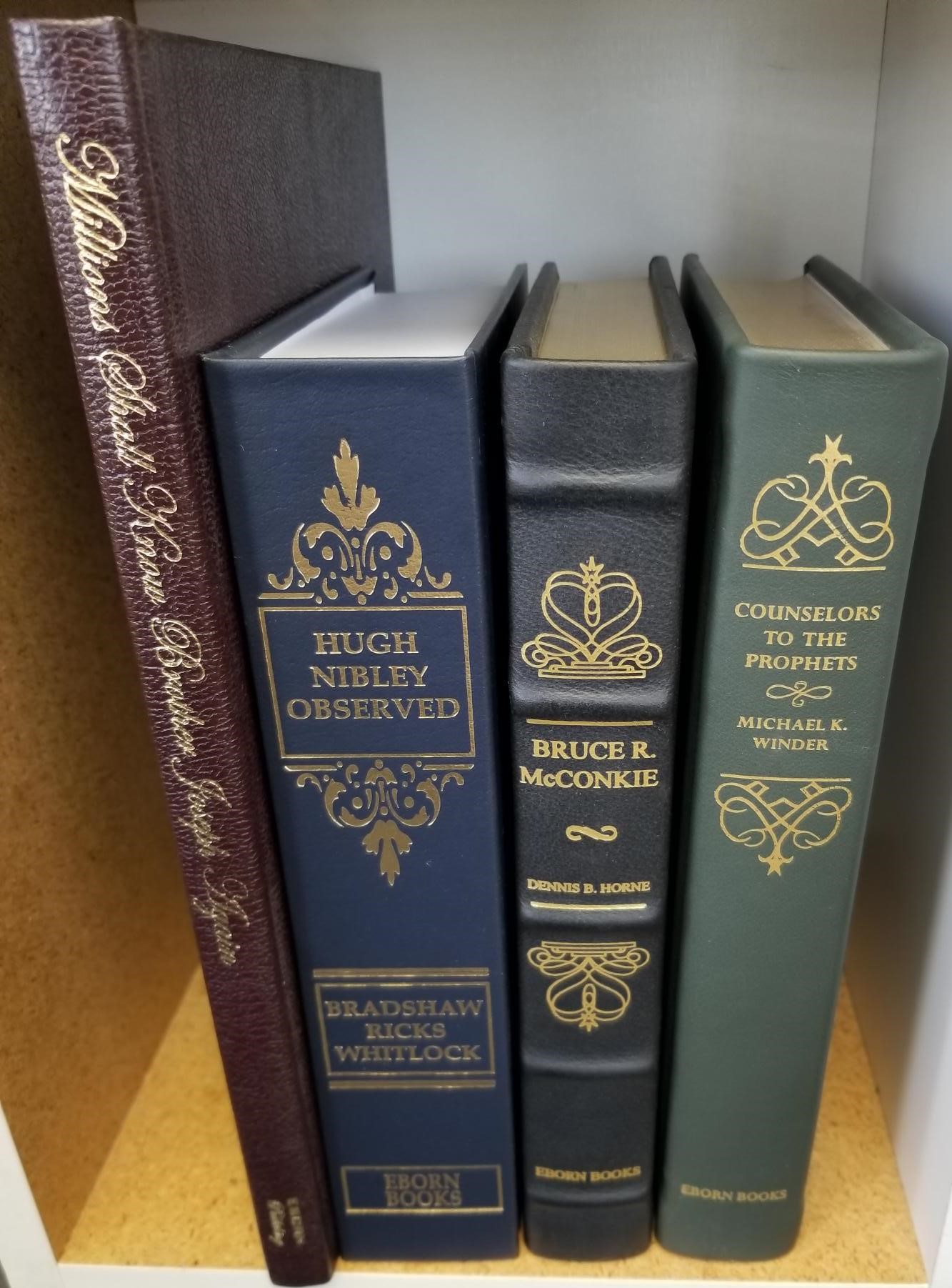 4 Eborn Books Leather Books: 1) Bruce R. McConkie (Horne), 2) Hugh Nibley Observed, 3) Counselors to the Prophets (Winder), 4) Millions Shall Know Brother Joseph Again (Tracy)