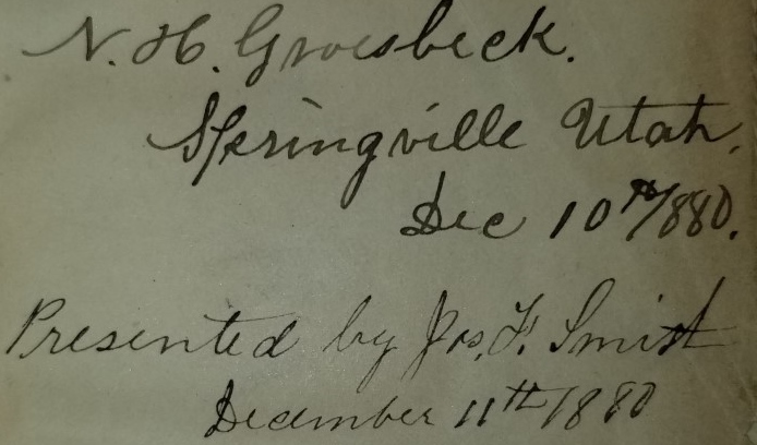 “N. H. Groesbeck. Springville, Utah, Dec 10th 1880. Presented by Jos. F. Smith, December 11th 1880.”