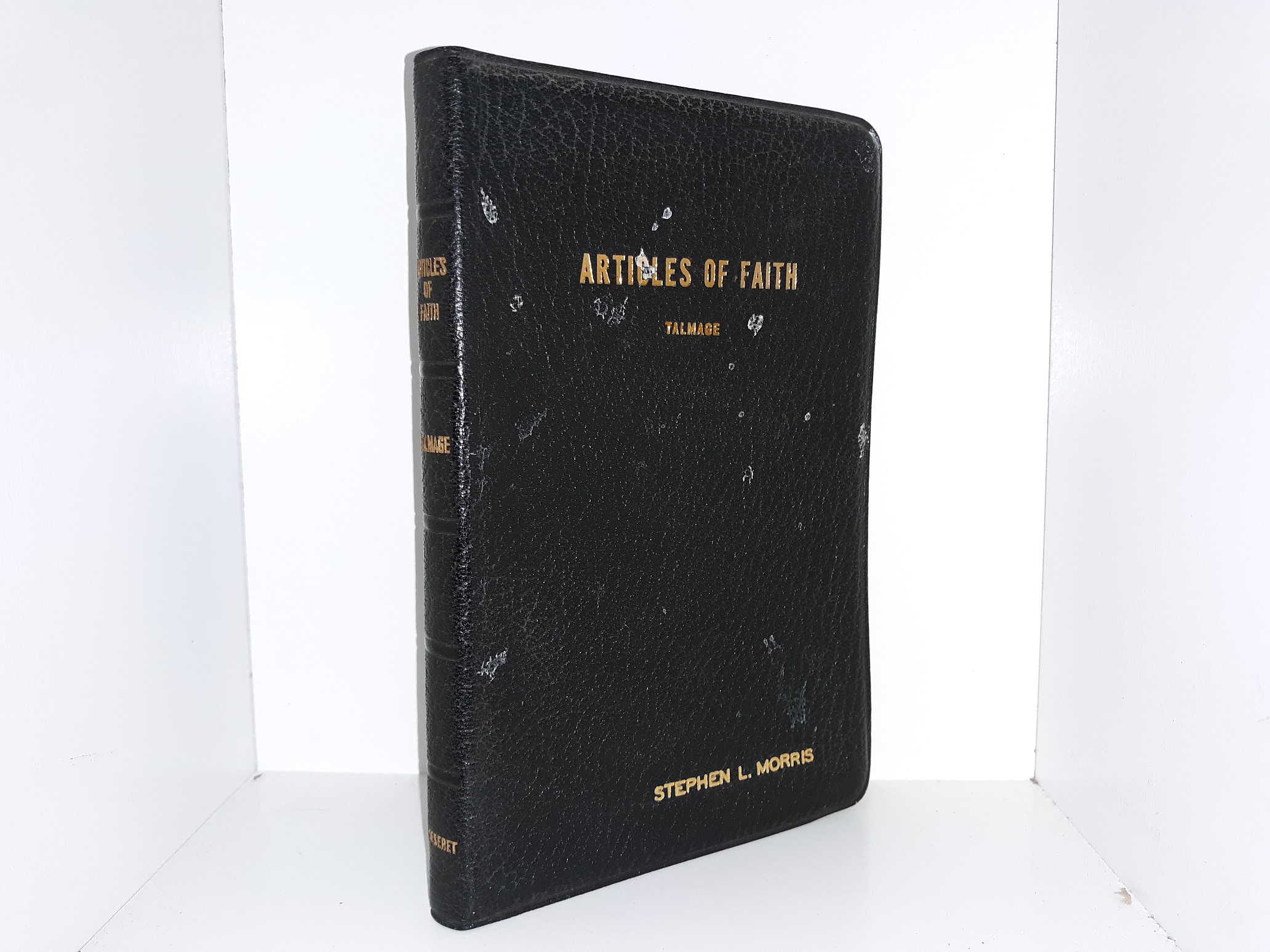 Fair condition, black, leather-bound book. The cover is covered in several white stain spots, and the name of a previous owner engraved upon it. The second flyleaf has a lengthy inscription written in pen, and some additional writing in pencil and eraser marks. The embossed edges of the pages have lost some of their embossing. Text throughout is clean, clear, and legible.