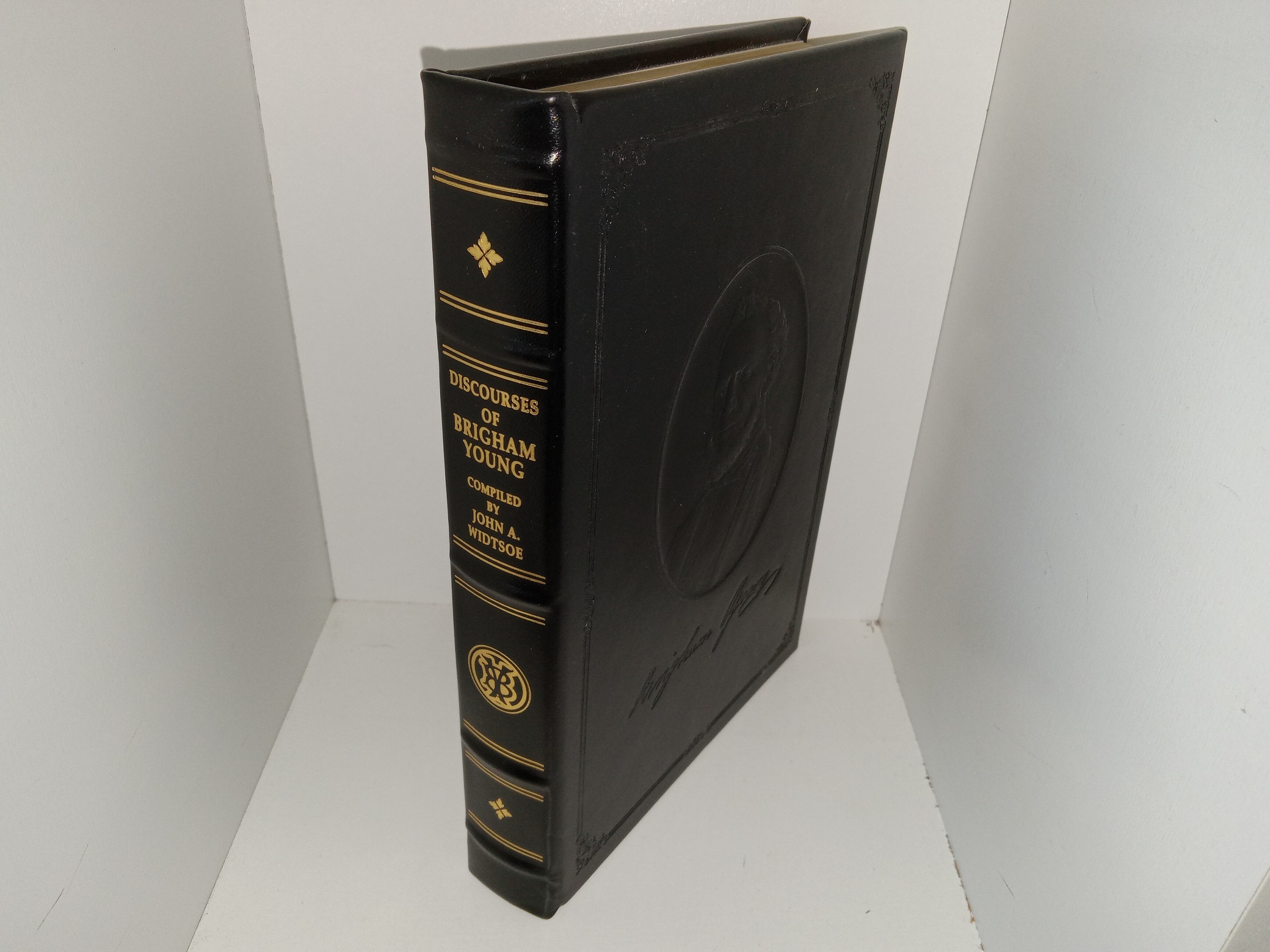 Good condition, black, leather-bound book. The cover has some scuff marks. The title page has writing in pencil. Text throughout is clean, clear, and legible.
