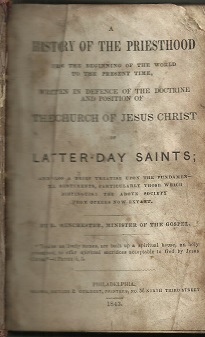 Winchester, Benjamin. A History of the Priesthood From the Beginning of the World to the Present Time, written in Defence of the Doctrine and Position of The Church of Jesus Christ of Latter-Day Saints, and also A Brief Treatise upon the Fundamental Sentiments, Particularly those which Distinguish the Above Society from others now extant. (By B. Winchester, Minister of the Gospel). Brown, Bicking & Guilbert, Printers, Philadelphia, 1843. 168 Pages. Small size brown leather; book measures about 3 1/2″ x 5 1/2″. Front free end sheet missing, so the book starts with the title page itself. Free end sheet in back is present. Binding is good; first 12 pages have one corner slightly worn or torn off. Pages 35-37 have a little bit of ink underlining. Otherwise the book is good with the expected wear to the binding and the expected foxing to the pages.