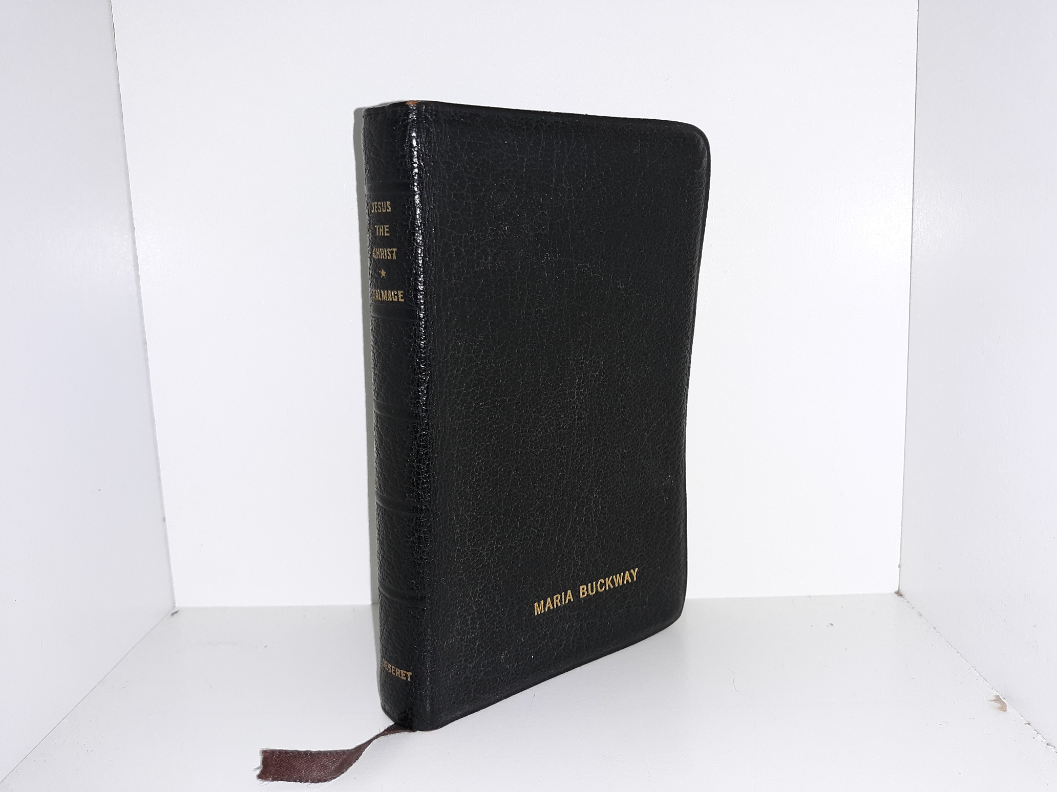 Fair condition, very small, black, leather-bound book with a dark brown ribbon bookmark. The cover has the name of a previous owner engraved upon it, and some tiny scuff marks. The pages throughout are wrinkled. There are notes and highlighting throughout the book, written in pencil and pen, with some eraser marks. The back second flyleaf has a scuffed indentation where a paperclip once sat.