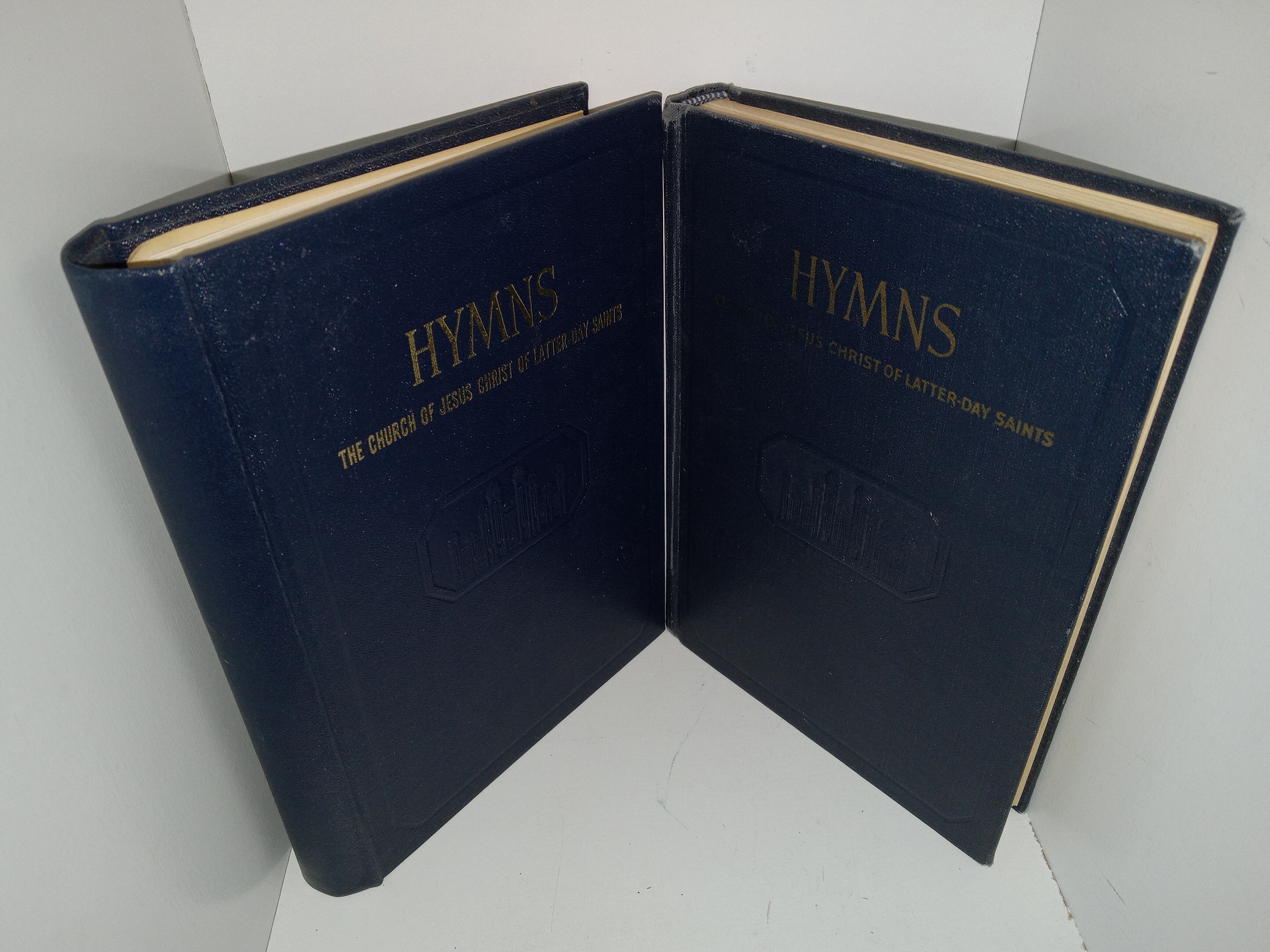 2 fair-good condition, dark blue hardcovers with no dust jackets. The covers have scuffing, some bent corners, and some small tears at the corners. Some pages have stains or yellowing. The page for Hymn #230 has long tears, tape (the tape causing some stains on the surrounding pages), adhesive residue, and wrinkling. The front inside covers and the front flyleaves have writing in pen and pencil, and eraser marks.