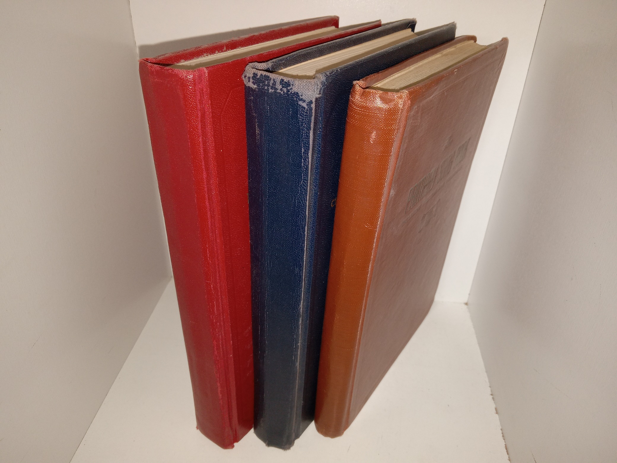 3 fair condition hardcovers with no dust jackets. The covers have scuffing, fading, crushed corners, scratches, and one may have the name of a previous owner engraved on the front. The internal bindings are slightly loose. The inside covers and flyleaves have writing and scribbles in pen and pencil, eraser marks, and ink stamps. Some pages have small stains, creases, or wrinkling.