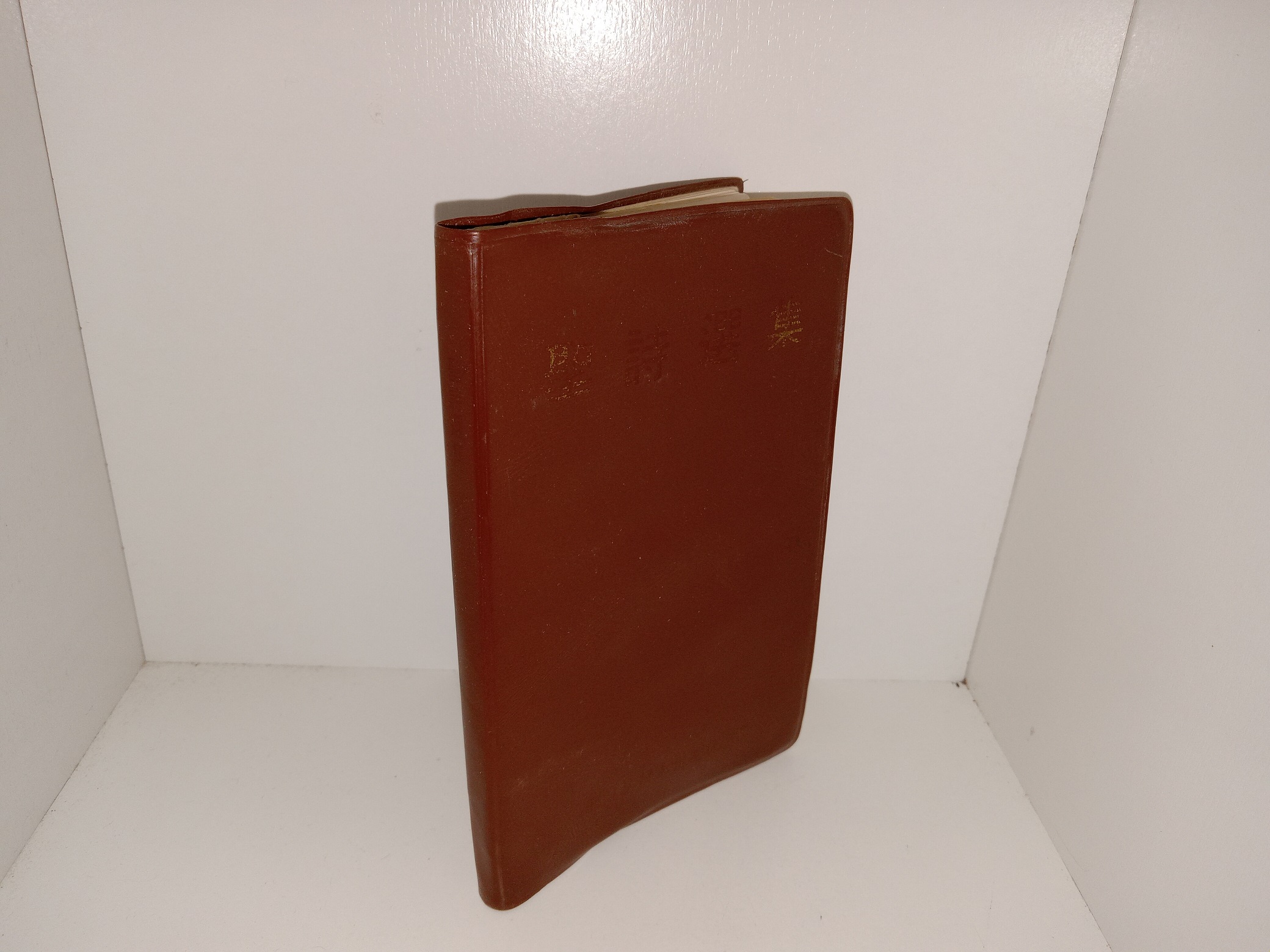 Fair condition, small, brown, vinyl book. The cover has scuffing, fading of the title, creasing, and some adhesive residue. Some pages have wrinkling. The front flyleaf has writing in pen. The following page has a stain, writing in pencil, and eraser marks. Text and illustrations throughout are clean, clear, and legible.