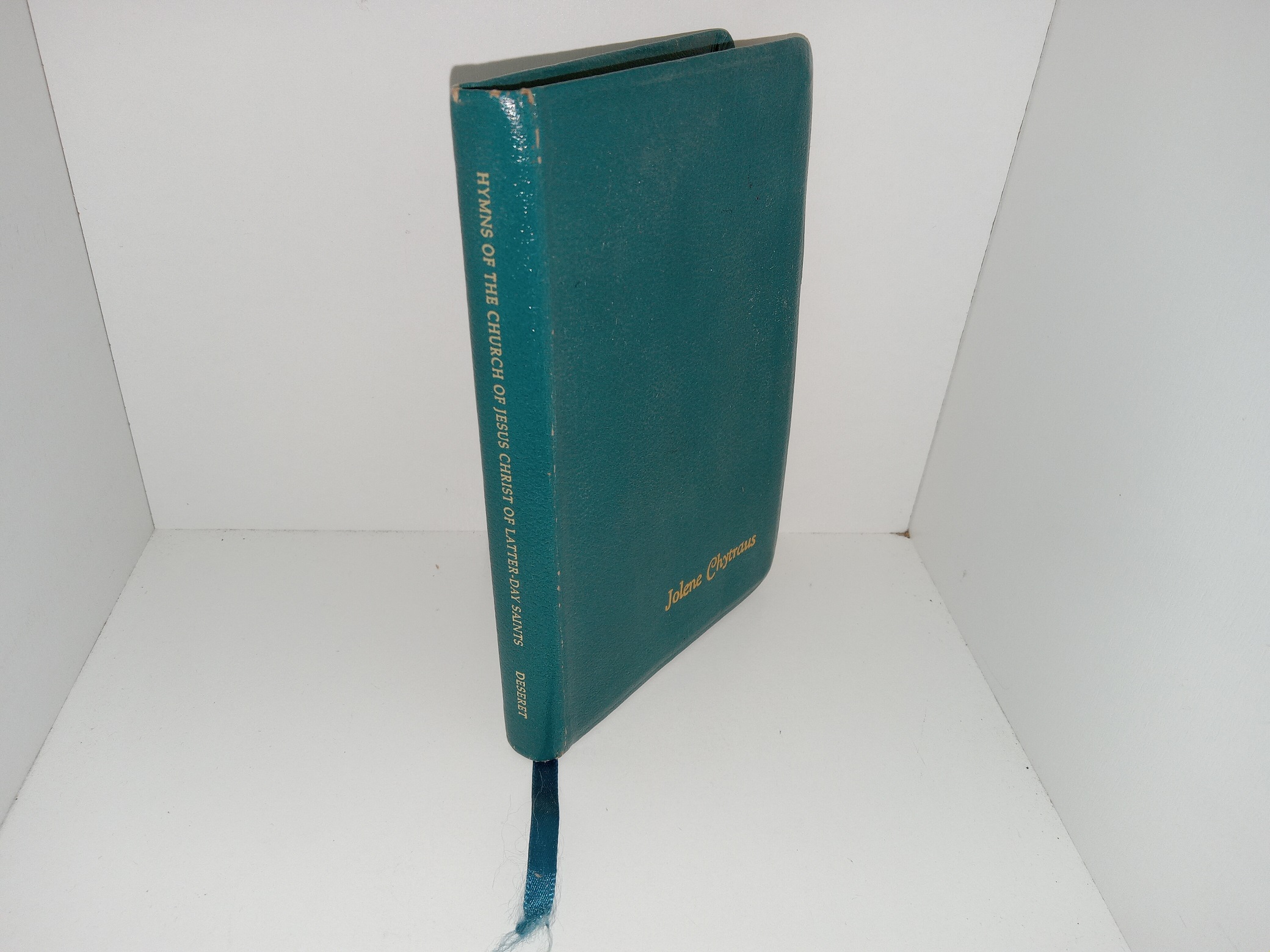 Good condition, small, teal, vinyl book. The cover has some scuffing and the name of a previous owner engraved upon it. The ribbon bookmark has some fraying. The title page has writing in pencil. Text and illustrations throughout are clean, clear, and legible.